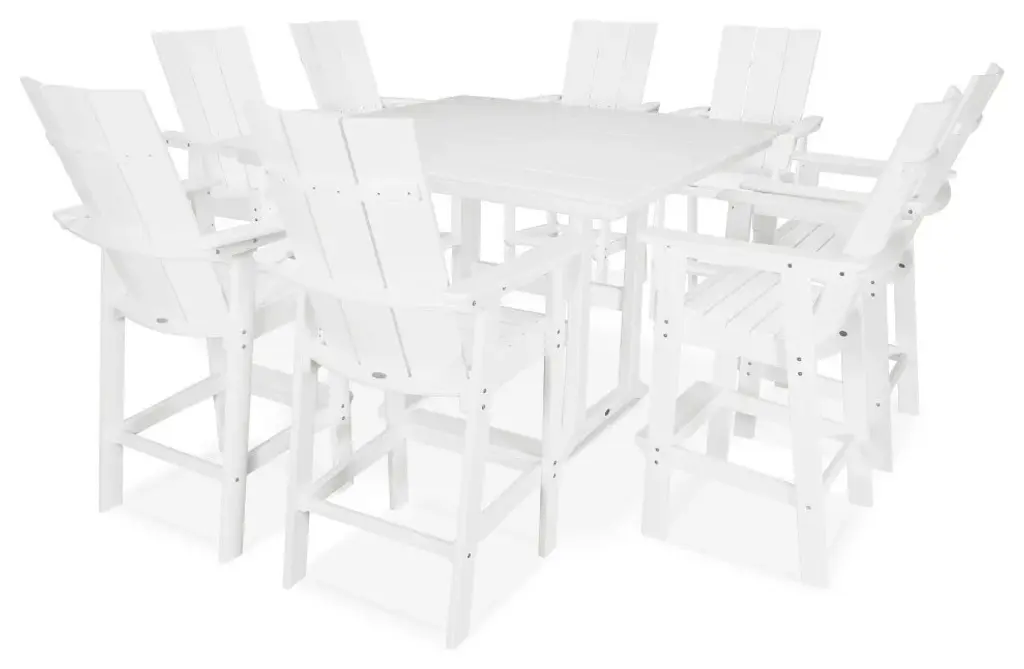 Gather friends and family for a meal outdoors around this all-weather modern bar set. With room for eight, the Modern Adirondack 9-Piece Farmhouse Bar Set allows everyone at the table to be a part of the conversation. The Modern Adirondack Bar Chairs feature a waterfall front detail while the Farmhouse 59" Bar Table provides a spacious tabletop and plenty of legroom underneath.Includes (8) Modern Adirondack Bar Chairs and (1) Farmhouse 59" Bar TableChairs feature a comfortably contoured, oversized seat, and waterfall frontBuilt to withstand a range of climates including hot sun, snowy winters, and strong coastal windsConstructed of genuine POLYWOOD lumber that is not prone to splinter, crack, chip, peel, or rot20-year residential warranty; 3-year commercial warrantyCleans easily with soap, water, and a soft bristle brushUV protectant and color continuously throughout the HDPE material; requires no painting or waterproofingMarine-grade quality hardwareMade in Syracuse, IndianaTable outfitted with 1.625" center hole for standard umbrella (sold separately); hole cover includedAssembly required