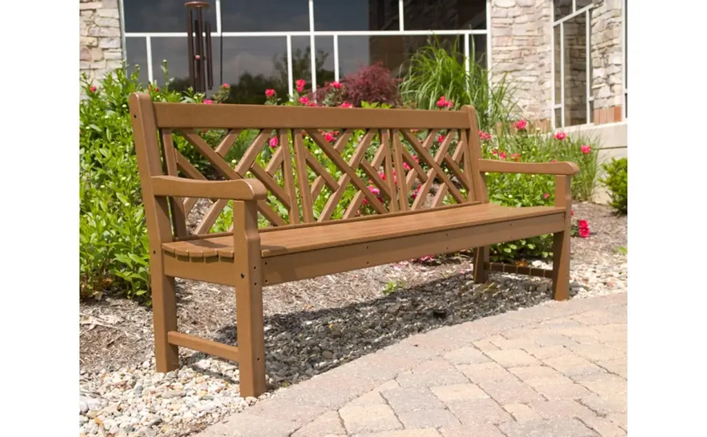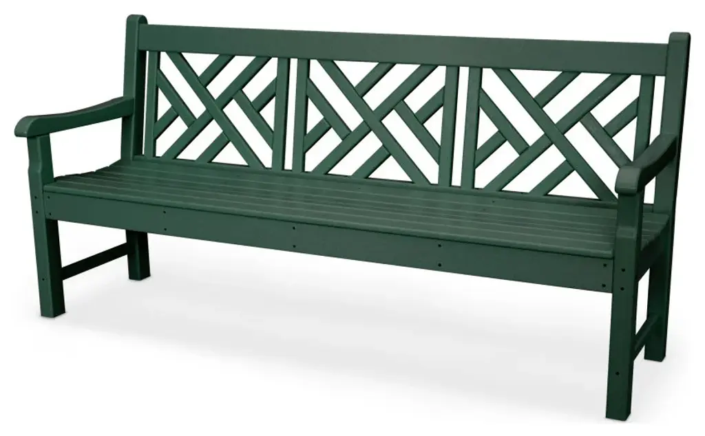 Add an elegant flair to your outdoor living space with the Rockford 72" Chippendale Bench. The unique pattern on the bench's back will make this a conversation starter, and the conversations will last for a long time once you and a loved one have a seat on this comfortable piece.Bench boasts elegant and inviting 18th century Chippendale-style back designBench features comfortably contoured seatBuilt to withstand a range of climates including hot sun, snowy winters, and strong coastal windsConstructed of genuine POLYWOOD lumber, a proprietary blend of plastics which includes recycled milk jugs and detergent bottlesDurable, all-weather lumber not prone to splinter, crack, chip, peel, or rot20-year residential warranty; 3-year commercial warrantyCleans easily with soap, water, and a soft-bristle brushUV protectant and color continuously throughout the HDPE material; requires no painting or waterproofing20-year residential warranty; 3-year commercial warrantyMarine-grade quality hardwareMade in the USAAssembly required