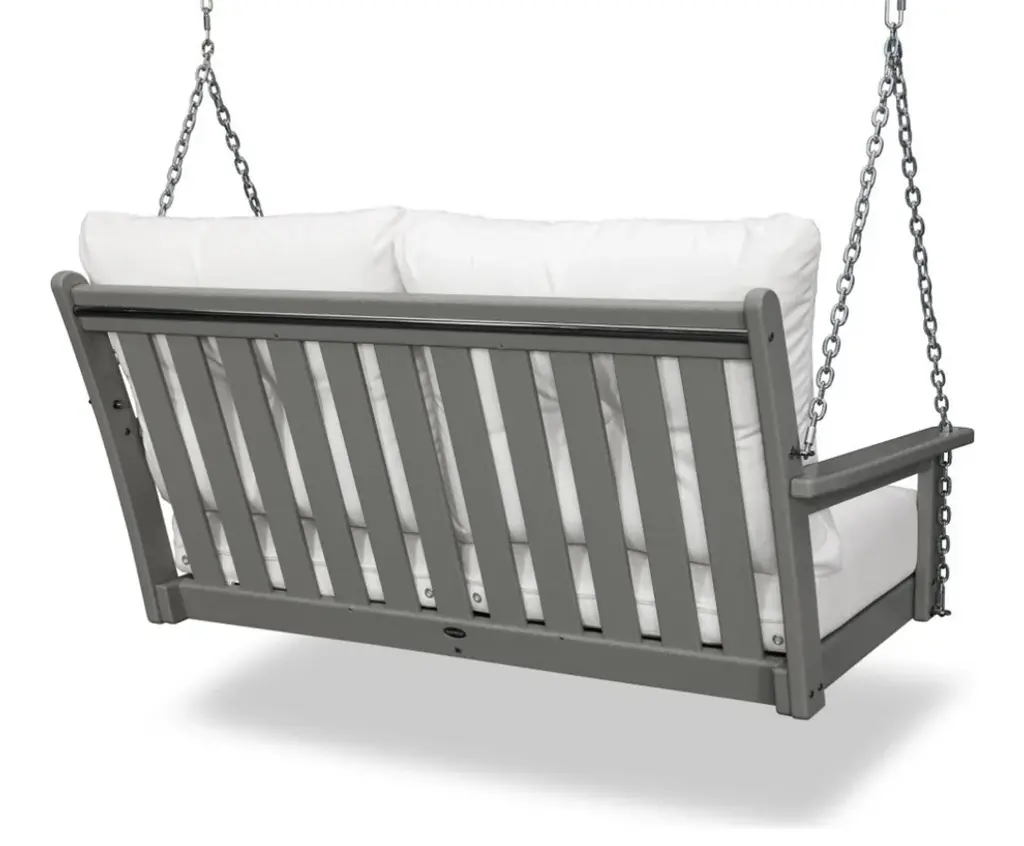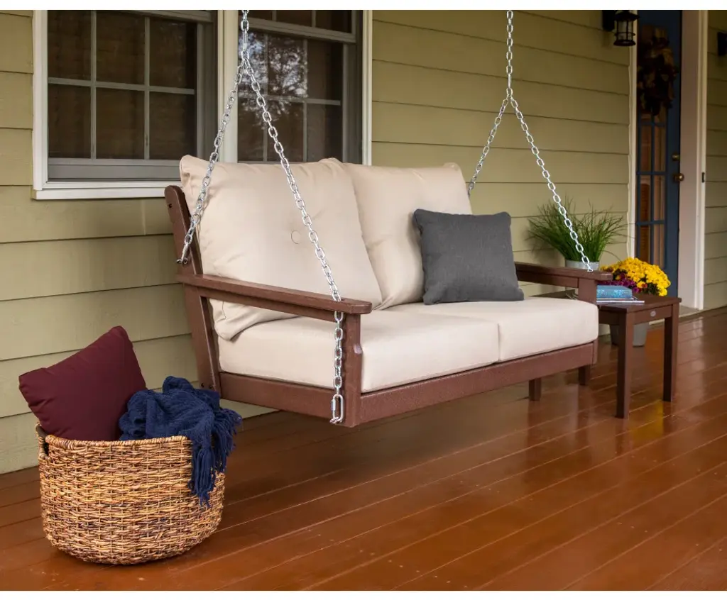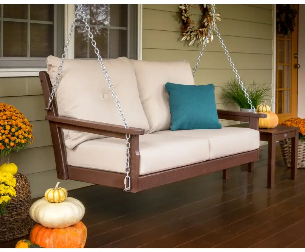The Vineyard Deep Seating Swing combines the cozy comfort of soft buttoned back pillows with the soothing motion of a swing. Perfect for two or roomy for one, this all-weather swing pairs well with Newport End Tables and the rest of the Vineyard Deep Seating Collection.Chain kit includedQuick drying, durable cushions covered in Sunbrella fabric that resist weather, salt, sun, mold and mildew.Built to withstand a range of climates including hot sun, snowy winters, and strong coastal windsConstructed of genuine POLYWOOD lumber that is not prone to splinter, crack, chip, peel, or rot20-year residential warranty; 3-year commercial warrantyCleans easily with soap, water, and a soft bristle brushUV protectant and color continuously throughout the HDPE material; requires no painting or waterproofingMarine-grade quality hardwareMade in Syracuse, IndianaAssembly required