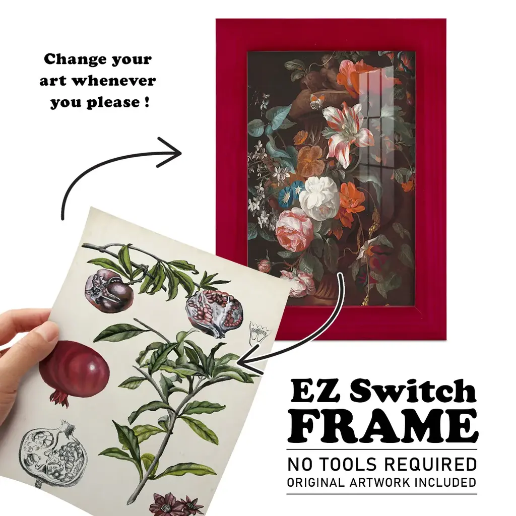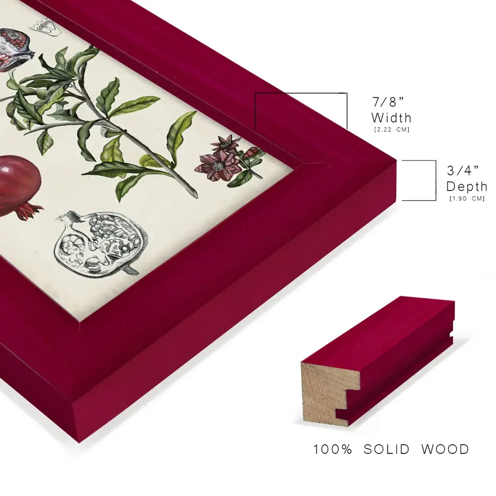 Pomegranate Composition I -EZ SWITCH Framed Print w/glass-Cherry Red A delightful, framed print. Featuring a solid wood frame with real wood glass. This premium print is giclee quality. In addition, every frame features a removable back and table top stand. This allows you to change your art in the future or to just stand the art on a table for a new look. We are sure you'll enjoy our new series of EZ SWITCH Framed Art. Solid Wood Frame Real Glass Removable / Replaceable Art Built in Tabletop Stand Sizes range from 4x6 up to 12x15 - buy just one or pair them up as sets as you see fit.