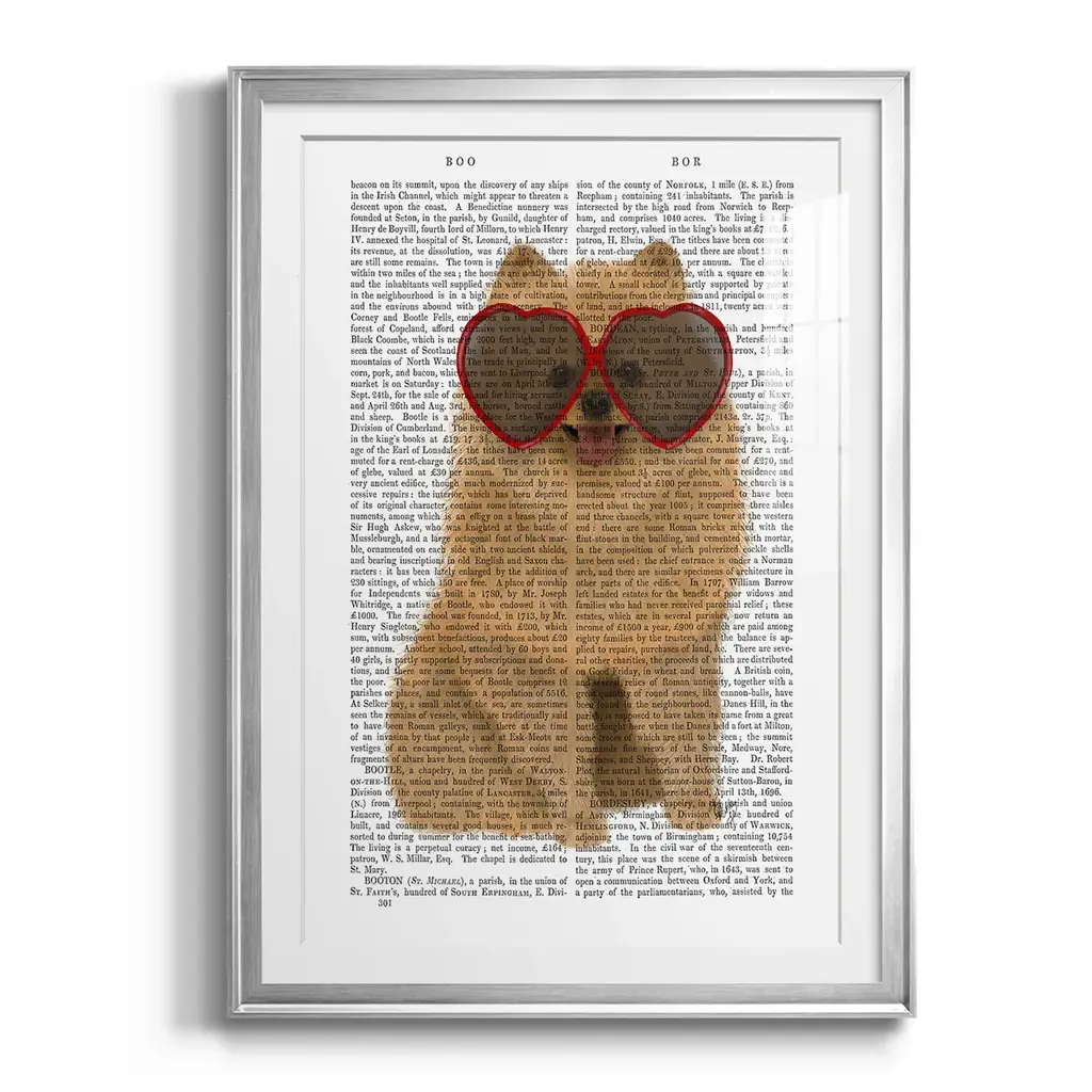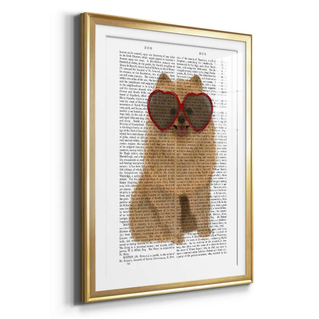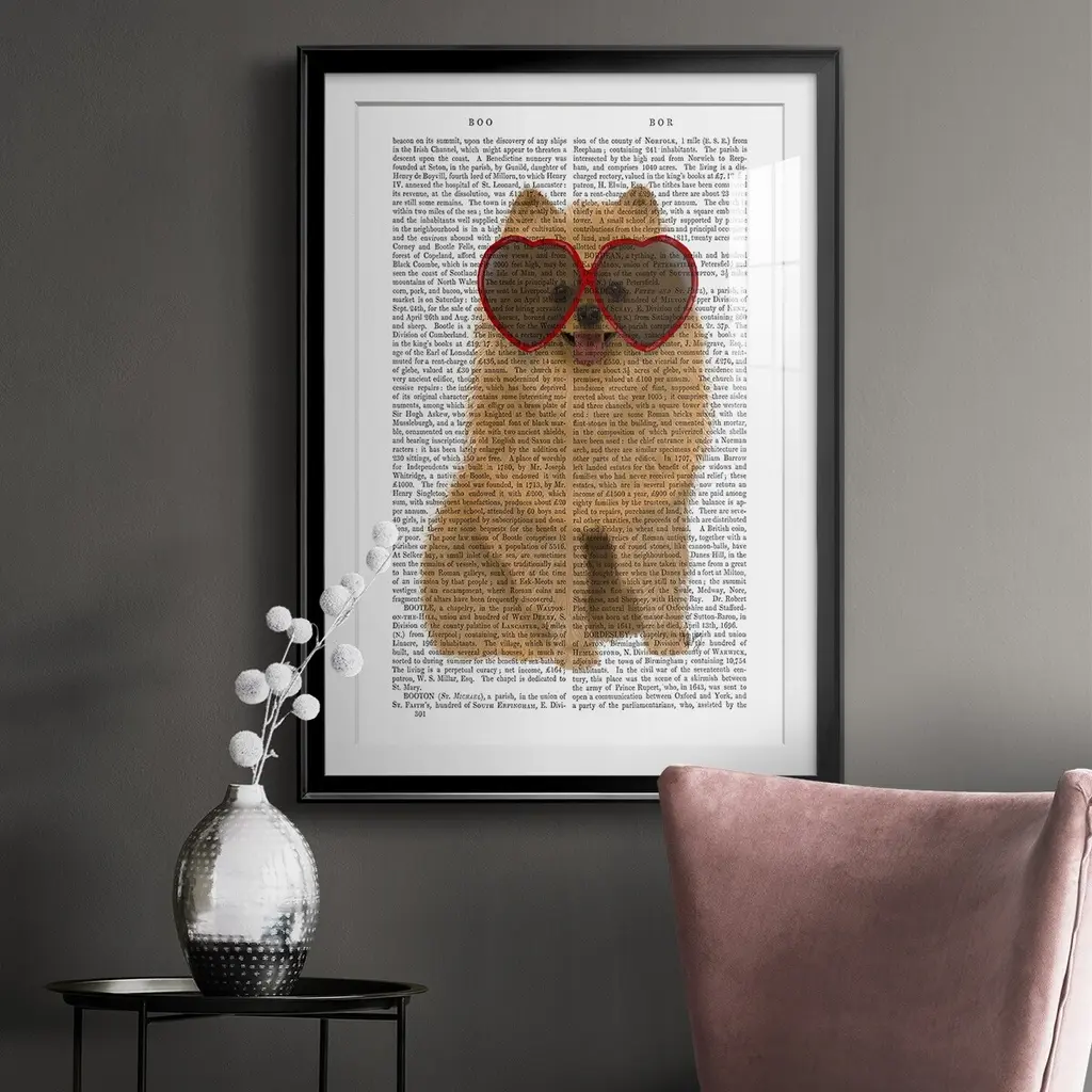 Pomeranian and Heart Glasses Premium Framed Print - Ready to Hang A Premium Framed Print created to last. Framed in distressed wood and available in an array of sizes and colors Featuring a beveled a solid wood stretcher bar, each piece comes ready to hand 4 SIZES AVAILABLE 30.5''X42.5'' - Overall Size 26.5'X36.5'' - Overall Size 22.5''x30.5'' - Overall Size 18.5''x24.5'' - Overall Size Each piece is made to order. Each piece comes with hanging hardware. Made in the USA Ready to Hang Giclee Paper Print Acrylic Glass Beveled Matt Board