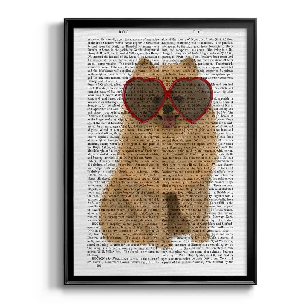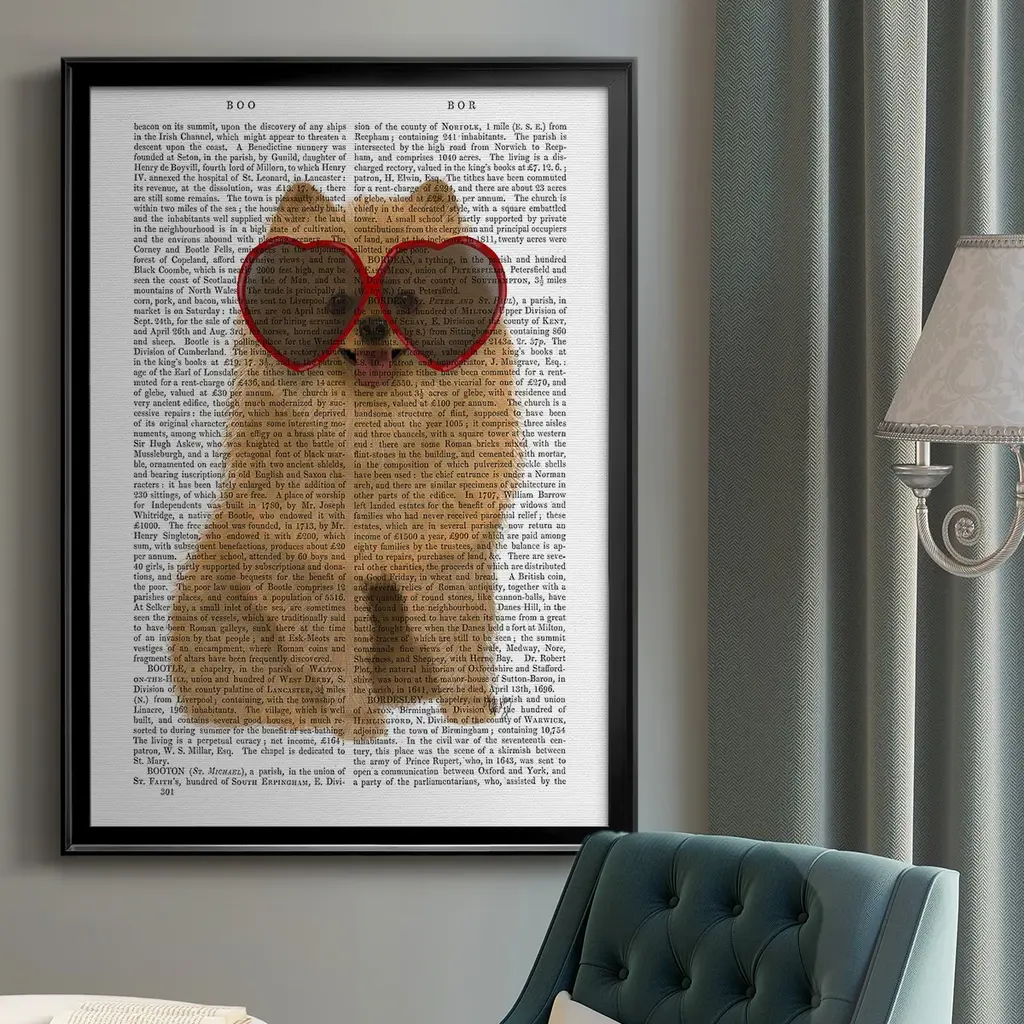 Pomeranian and Heart Glasses Premium Framed Print - Ready to Hang A Premium Framed Print created to last. Framed in distressed wood and available in an array of sizes and colors Featuring a beveled a solid wood stretcher bar, each piece comes ready to hand 4 SIZES AVAILABLE 30.5''X42.5'' - Overall Size 26.5'X36.5'' - Overall Size 22.5''x30.5'' - Overall Size 18.5''x24.5'' - Overall Size Each piece is made to order. Each piece comes with hanging hardware. Made in the USA Ready to Hang