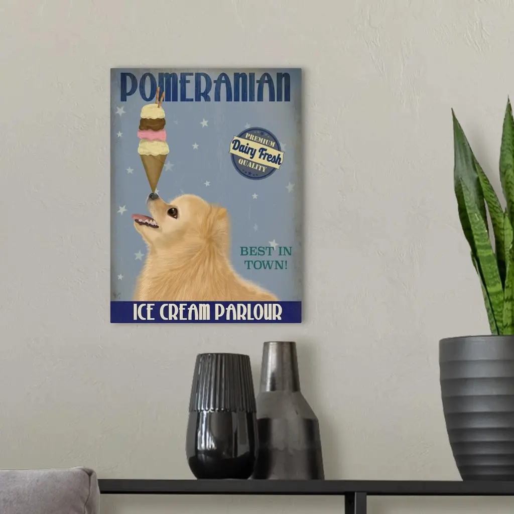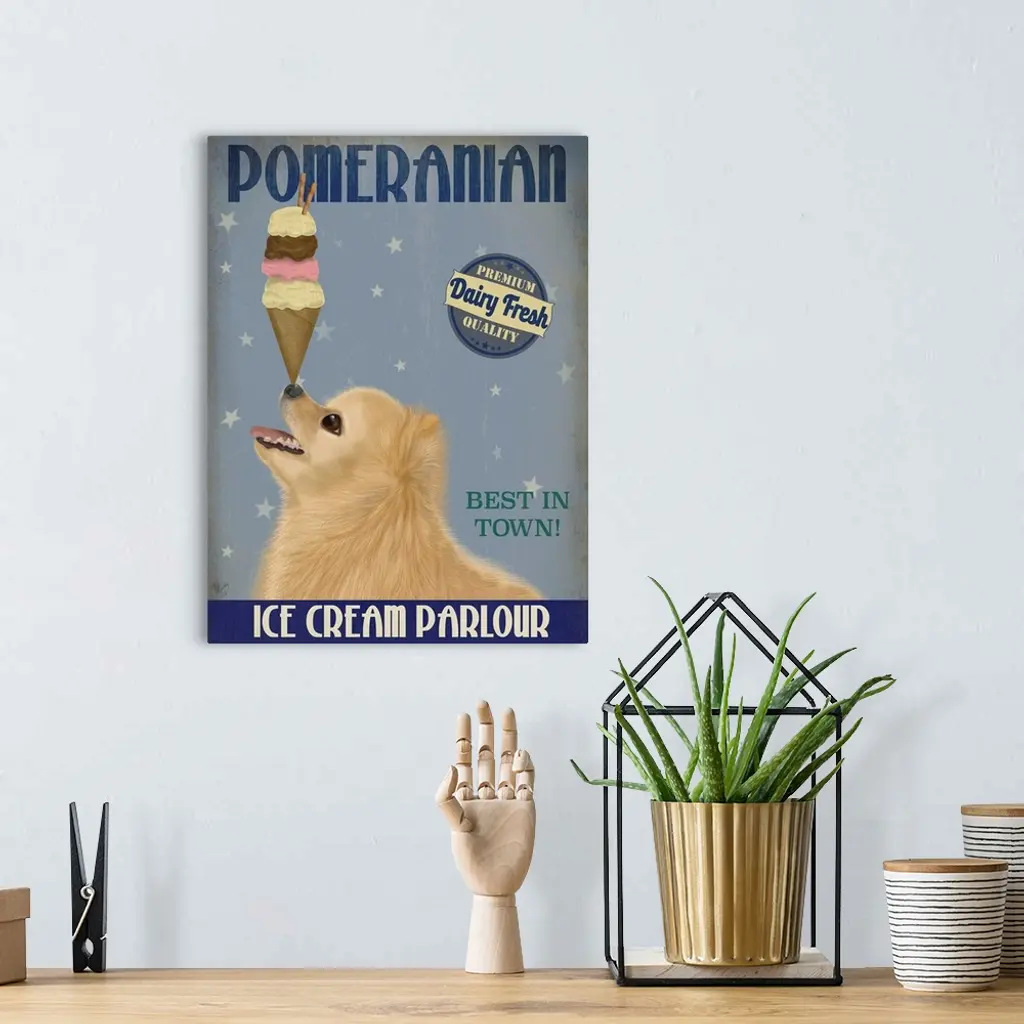 Decorative artwork of a Pomeranian balancing an ice cream cone on its nose in an advertisement for an ice cream parlour.