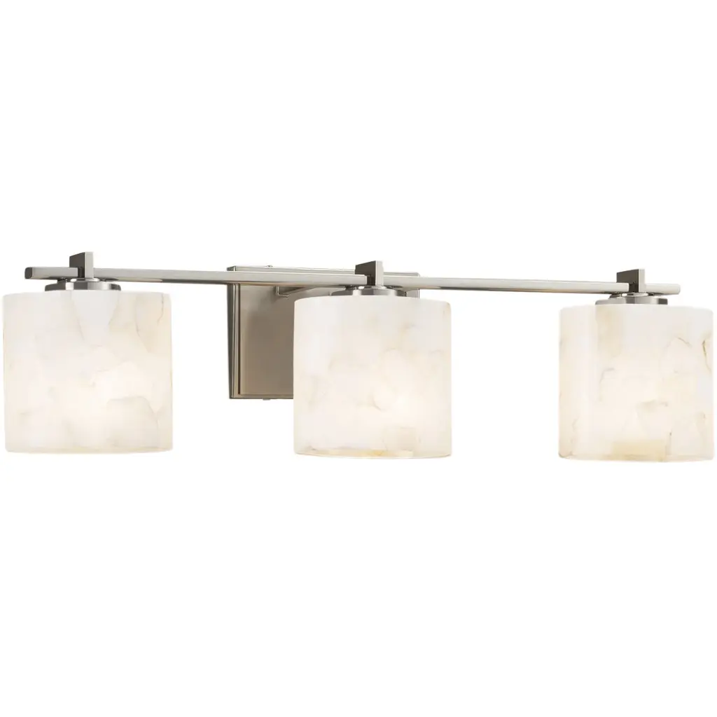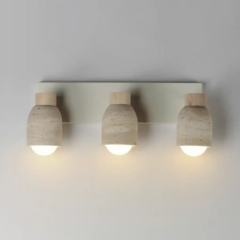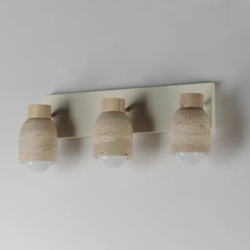 The Pompeii Vanity Light from Maxim Lighting brings a mix of organic texture and transitional style to bathrooms and other living spaces. Three cylindrical lamps extend outward from a rectangular wall plate, each showcasing a carved stone shade available in Travertine or volcanic Lava Rock. The Travertine option pairs with White Oak and Ecru white accents, while the Lava Rock is matched with Walnut and a matte black finish. With its bold materials and warm textures, this broad-reaching vanity light highlights the beauty of natural imperfection in an engaging, balanced form.