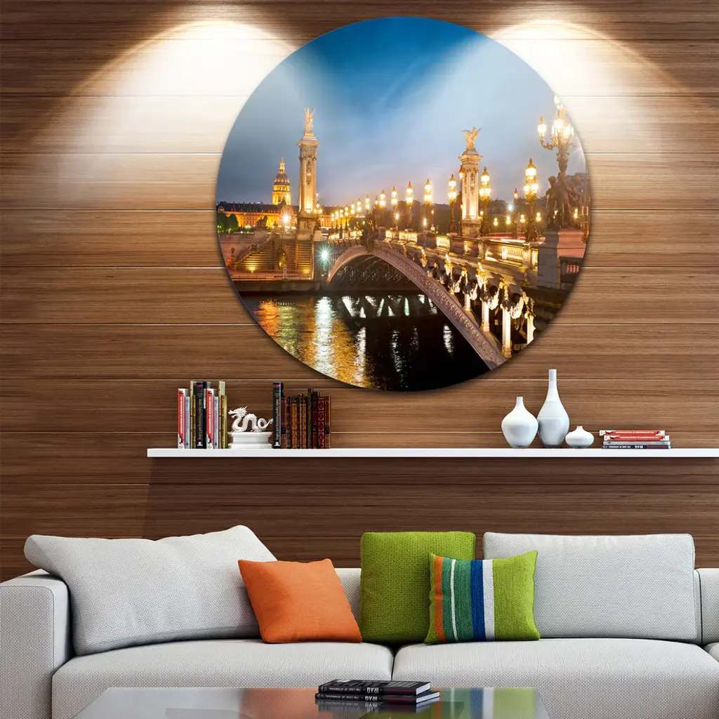 Bring Contemporary Abstraction to your home with this large Circle Metal wall art. This Pont Alexandre III Bridge Metal Artwork makes it the focal point of any room or office. - White Gloss Coating ensures colors are extra vibrant with light reflection.- Aluminum grade Sheet Metal with 1 inch mounting frame on the back giving the illusion that the artwork is floating on the wall..- Mounting Brackets are included along with instructions.- High Quality Digital images are created directly into a glossy aluminum panel producing a stunning and captivating print into the glossy finish of the metal.- Water, Fire and Scratch resistant HD Aluminum panels.- Looks better than any photo paper and guaranteed to last at least 20 years- Easy to clean with a microfiber cloth. Colors are far superior to regular Canvas Art. - Easy to Hang