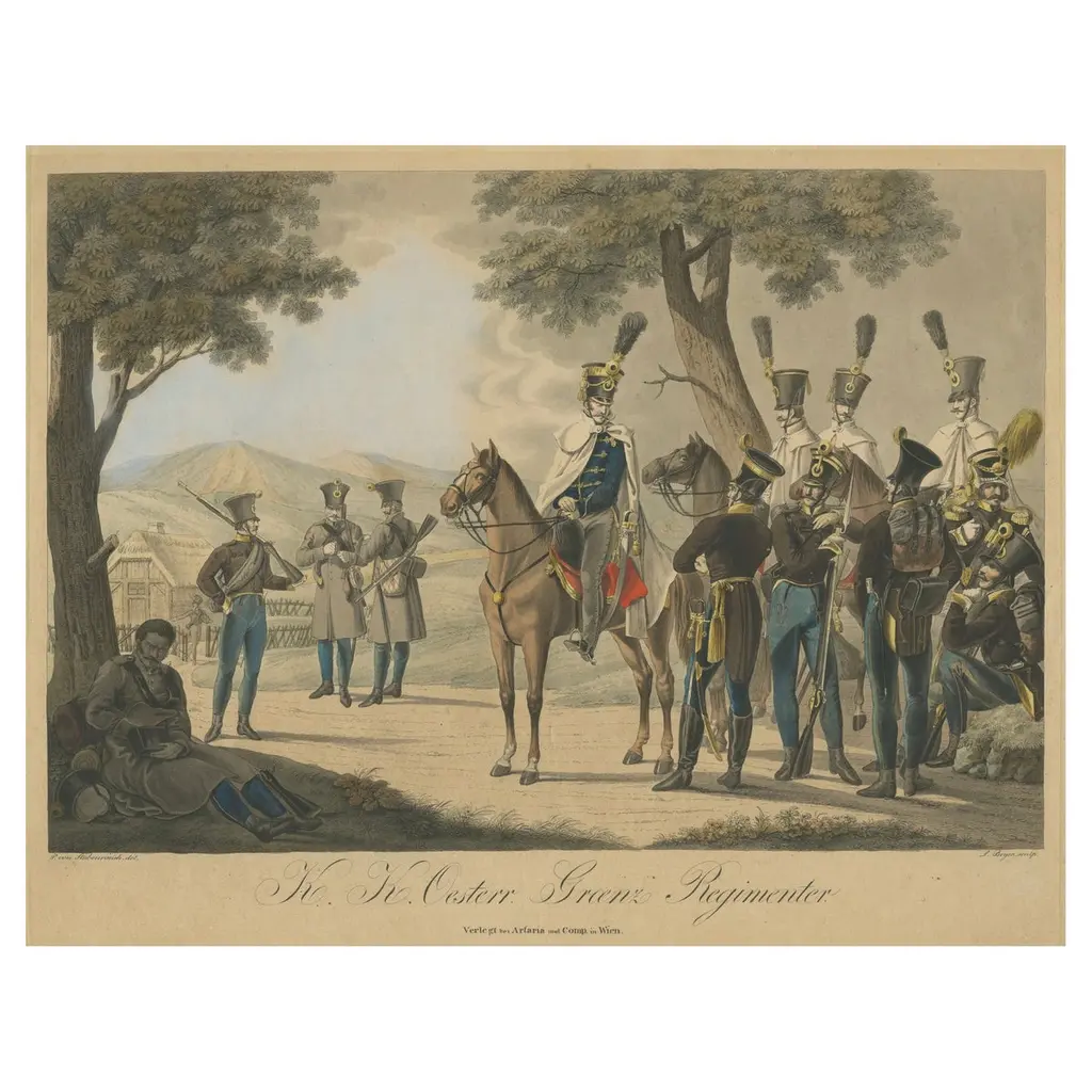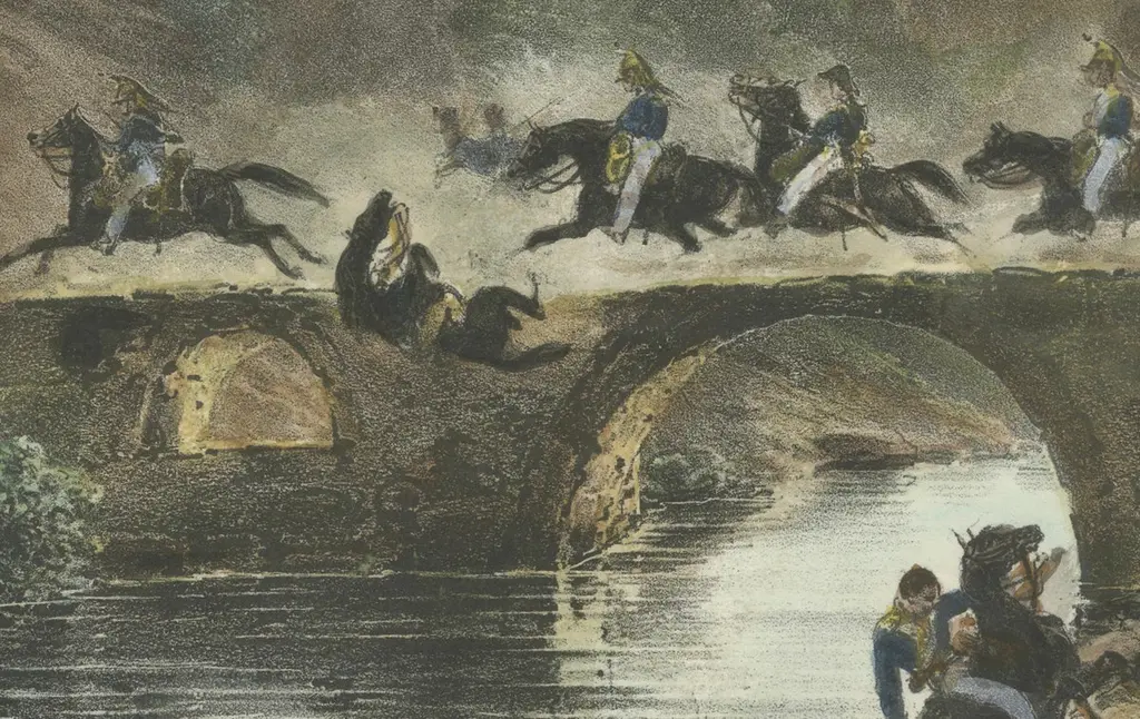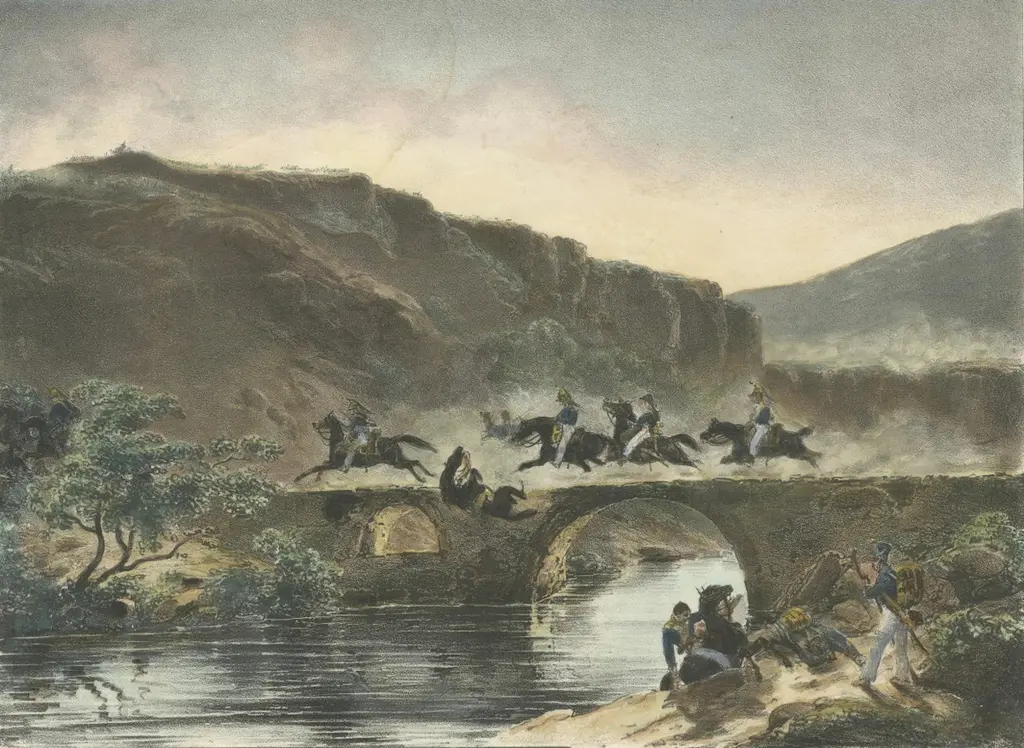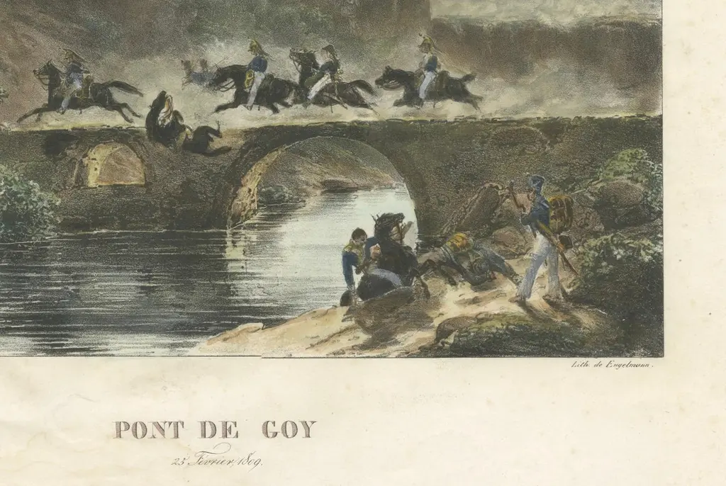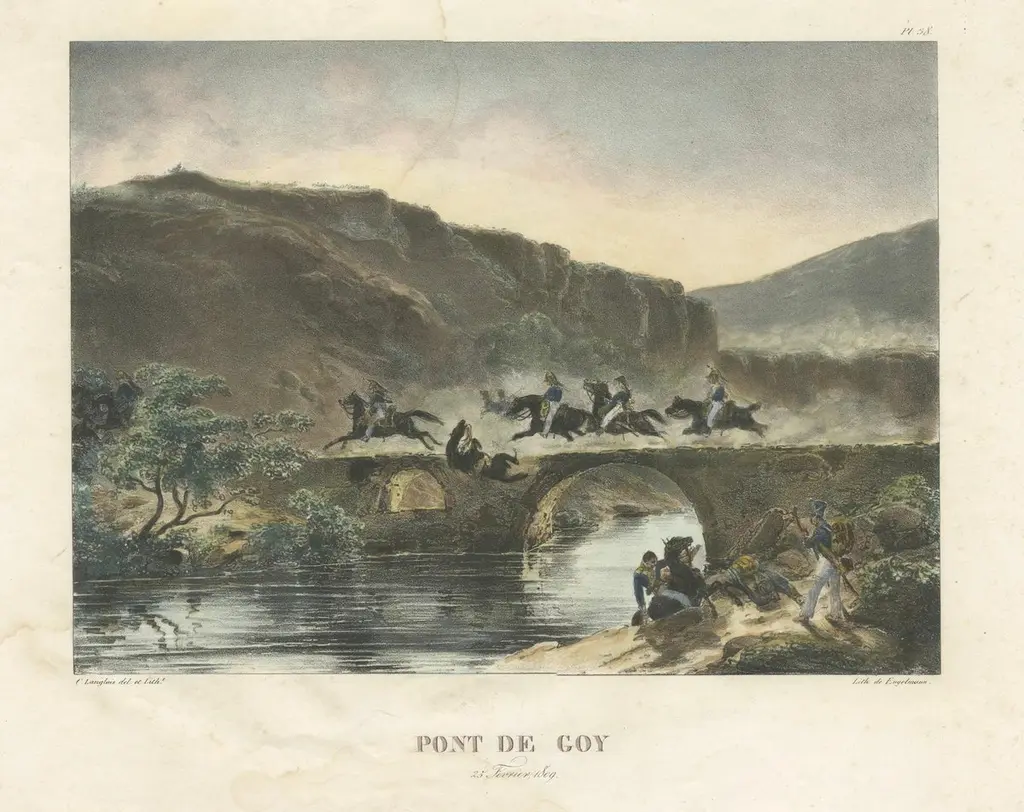 This lithograph, titled "Pont de Coy," was drawn by C. Langlois and lithographed by Godefroy Engelmann. It illustrates a dramatic scene of French soldiers crossing the Pont de Coy (Coy Bridge) during the Napoleonic Wars, possibly in a moment of retreat or pursuit. The artwork captures the rugged terrain and the narrow stone bridge spanning a calm river, with mounted troops and infantry navigating the challenging landscape. The dynamic composition and rich detailing evoke the tension and urgency of the event.As part of a series depicting the Peninsular War, this lithograph highlights the strategic importance of natural and manmade features, such as rivers and bridges, during military campaigns. Engelmann’s lithographic skills bring depth and life to Langlois’ original drawing, making it a valuable historical and artistic piece.Condition: Fair overall condition with visible water stains and light foxing, mostly around the edges. Colors remain vivid, and there are no major tears or damages to the image area.Keywords: Pont de Coy lithograph, Napoleonic Wars art, Peninsular War prints, French military history, 19th-century lithography, Engelmann Langlois, historical bridge art, collectible military print, Spanish campaign, historic landscapes. This print is ideal for collectors of Napoleonic or military-themed art and lovers of historical lithography.