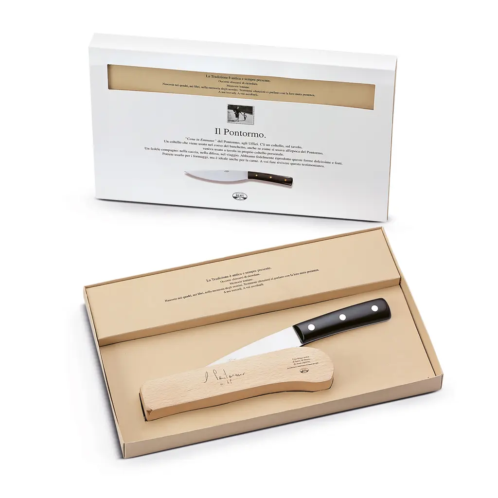 The Pontormo knife is an extremely versatile tool, designed to handle multiple uses with ease due to its unique shape. This knife is a reproduction of one depicted in the painting “Supper at Emmaus” by Jacopo Carucci, also known as Jacopo da Pontormo, displayed at the Uffizi Gallery in Florence. Ideal for cutting cheese, meat, and vegetables, the Pontormo knife features a blade angled to the handle for better force application. Its curved cutting edge functions like a crescent, and the blade’s width allows you to easily pick up the cut pieces. The smooth blade ensures precise cuts, preserving the food’s flavor and appearance. The knife comes with a unique log for safe storage, making it easily accessible at all times. This practical tool also serves as an original gift idea and a decorative item for the kitchen.