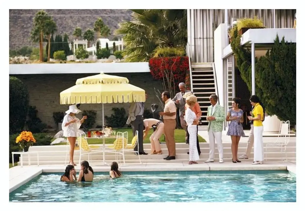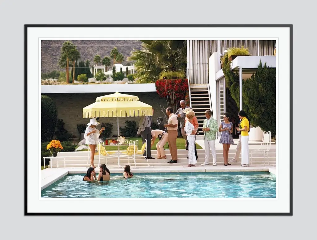 Poolside Party 1970 Guests by the pool at Nelda Linsk’s desert house in Palm Springs, January 1970. The house was designed by Richard Neutra for Edgar J. Kaufmann. Slim Aarons Slim Aarons was one of the twentieth century’s most prolific documenters of celebrity and socialite life. Over six decades, Aarons photographed some of the world’s most beautiful people in some of the globes most desirable destinations: jet-setting from Beverly Hills to Capri to the French Riviera, Aarons snapped the likes of the Kennedy family, Humphrey Bogart, Marilyn Monroe, and Grace Kelly. Paper size - 40x60" / 101x152 cm Approx frame size - 47x67" / 119x170 cm Stamped and issued by the Getty Images Archive London England (sole owners of the Slim Aarons Collection) made utilising the original transparency c print Framed in black solid wood frame with mount and glazing - ready to hang Ships securely from London Printed later