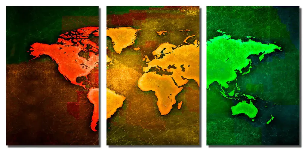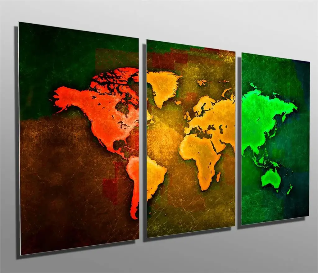 36"œ x 18"œ total size. Ready To Hang! (3 pieces - 12"œ x 18"œ each). 3 Panel Split (Triptych) Pop Art World Map Metal Print. Featuring pop art style colors (red, light brown, lime-green). Modern metal wall art for home or office wall decor & interior design. Printed on Luxurious, HD aluminum glossy metal panels.. HD aluminum panels. Metal print wall art. Includes Shadow Wall Mount on the back.• Aluminum Metal Wall Art• Made in USA• Ready to hang - No assembly required• Shadow mount hardware on the back• 0.045"œ thick HD Aluminum Panels• Scratch resistant, glossy finish• Superb color clarity, luxurious prints• Epson printing process• For indoor or moisture rich environment use• Easy to clean. Gently wipe with microfiber cloth.