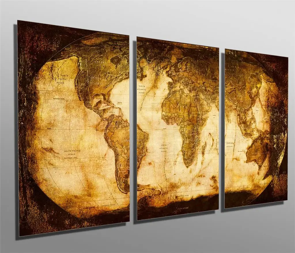60"œ x 30"œ total size. Ready To Hang! (3 pieces - 20"œ x 30"œ each). 3 Panel Split (Triptych) Pop Art World Map Metal Print. Featuring pop art style colors (red, light brown, lime-green). Modern metal wall art for home or office wall decor & interior design. Printed on Luxurious, HD aluminum glossy metal panels.. HD aluminum panels. Metal print wall art. Includes Shadow Wall Mount on the back.• Aluminum Metal Wall Art• Made in USA• Ready to hang - No assembly required• Shadow mount hardware on the back• 0.045"œ thick HD Aluminum Panels• Scratch resistant, glossy finish• Superb color clarity, luxurious prints• Epson printing process• For indoor or moisture rich environment use• Easy to clean. Gently wipe with microfiber cloth.