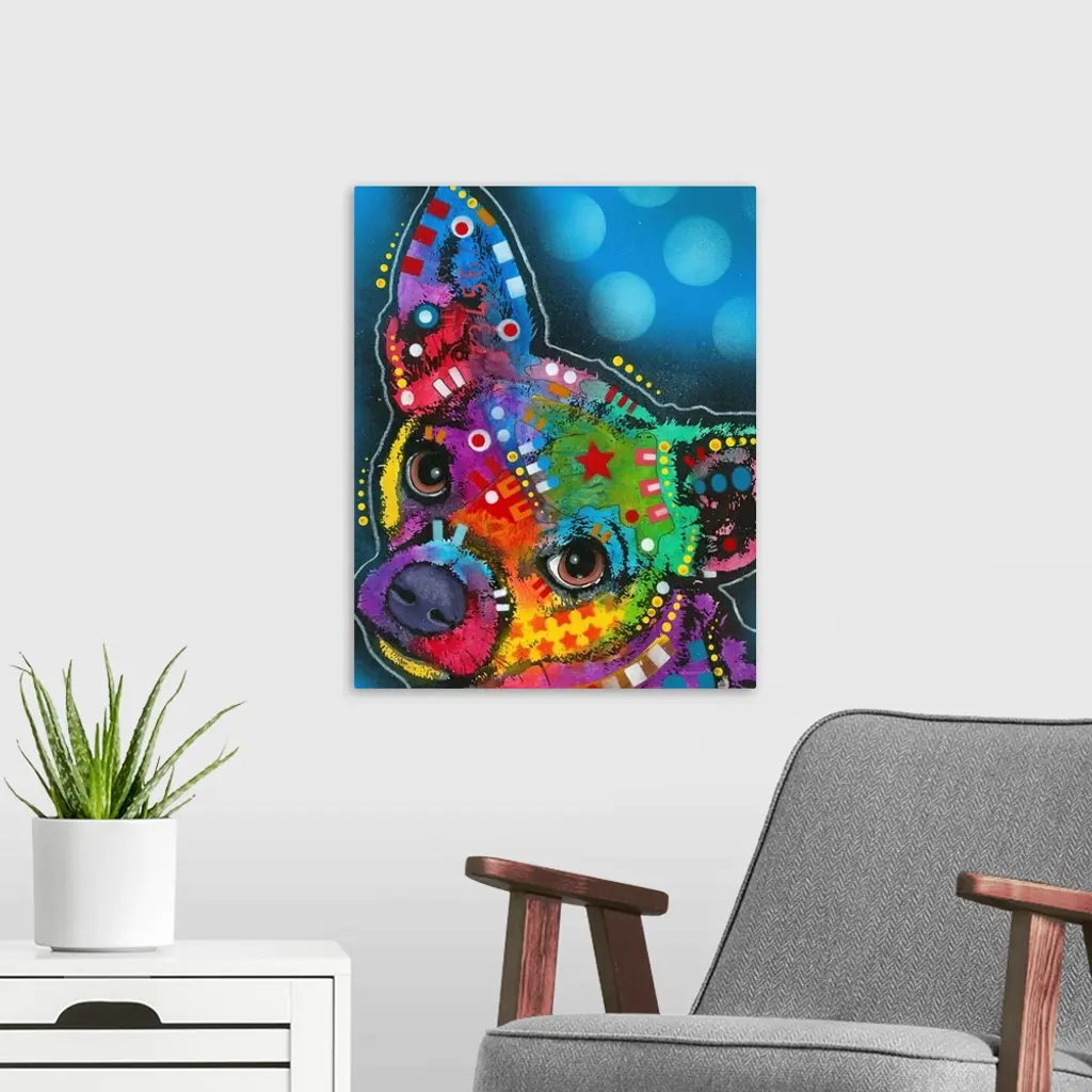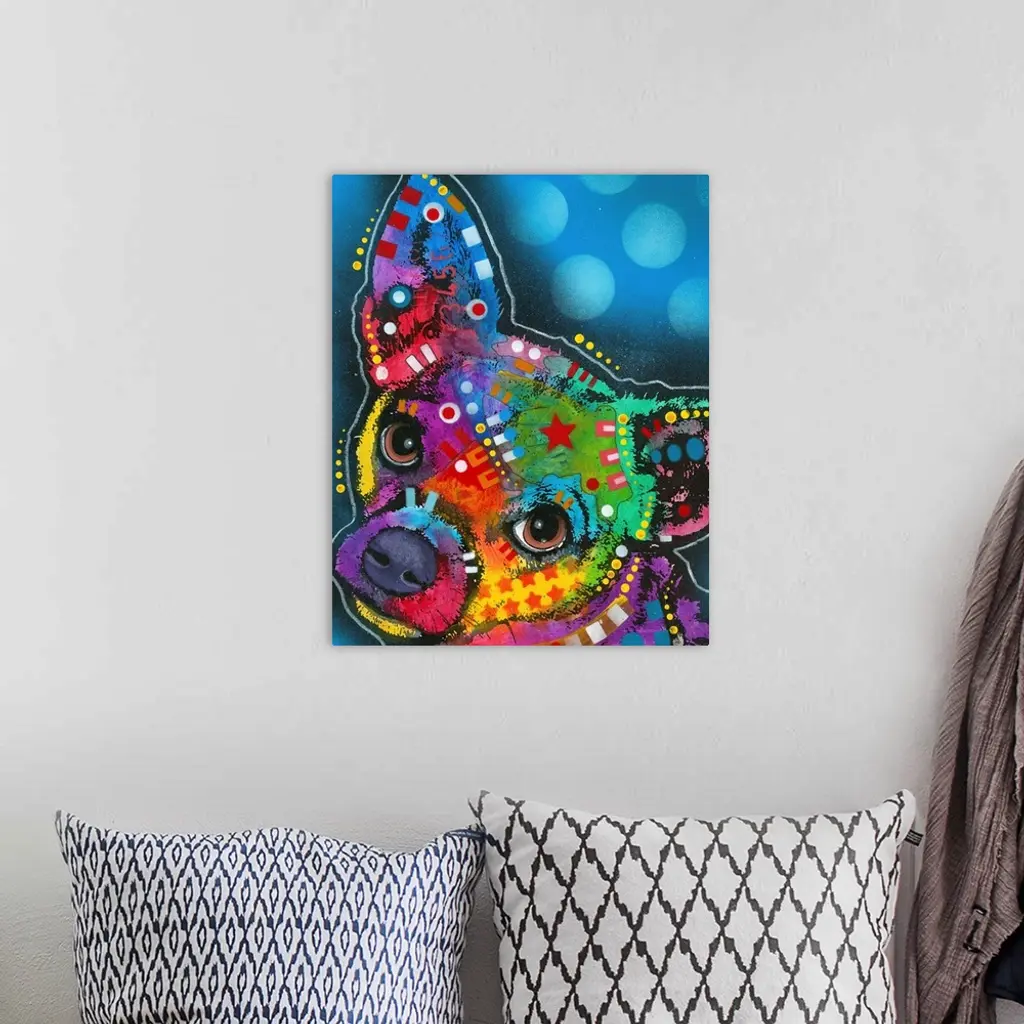 Colorful painting of a Chihuahua covered in geometric abstract markings on a blue background.