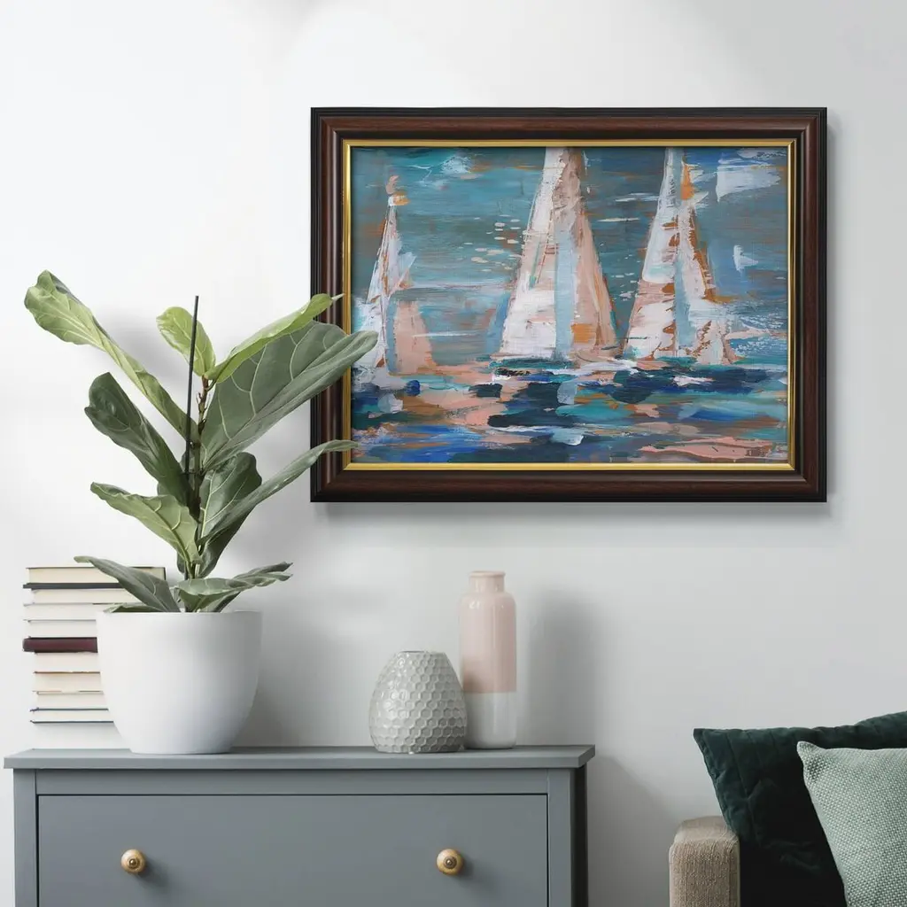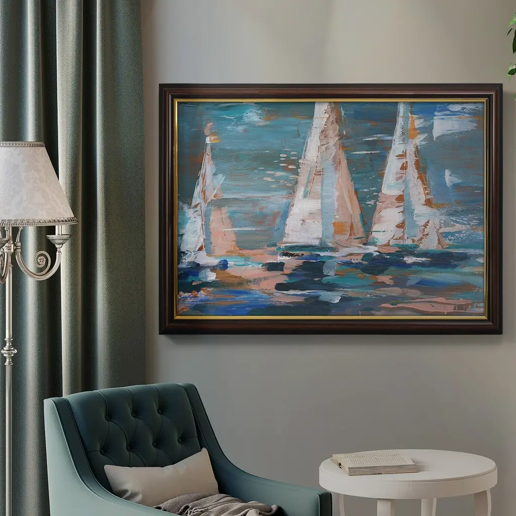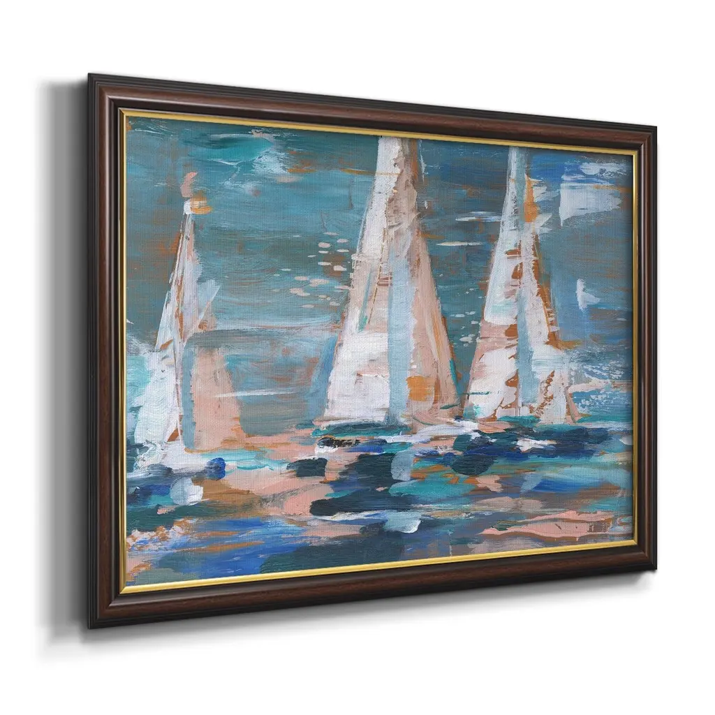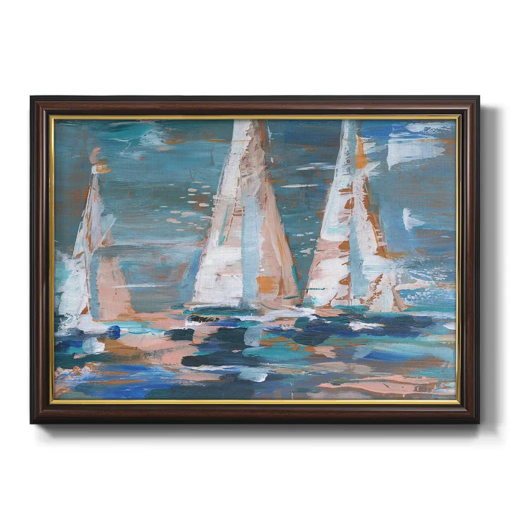 Pop Regatta II Premium Framed Canvas- Ready to Hang A Premium Framed Canvas created to last. Framed in distressed wood and available in an array of sizes and colors Featuring a beveled a solid wood stretcher bar, each piece comes ready to hand 3 SIZES AVAILABLE 16''X20'' - Overall Size 18'X27'' - Overall Size 24''x36'' - Overall Size Each piece is made to order. Each piece comes with hanging hardware. Made in the USA Ready to Hang Giclee Paper Print Acrylic Glass Beveled Matt Board