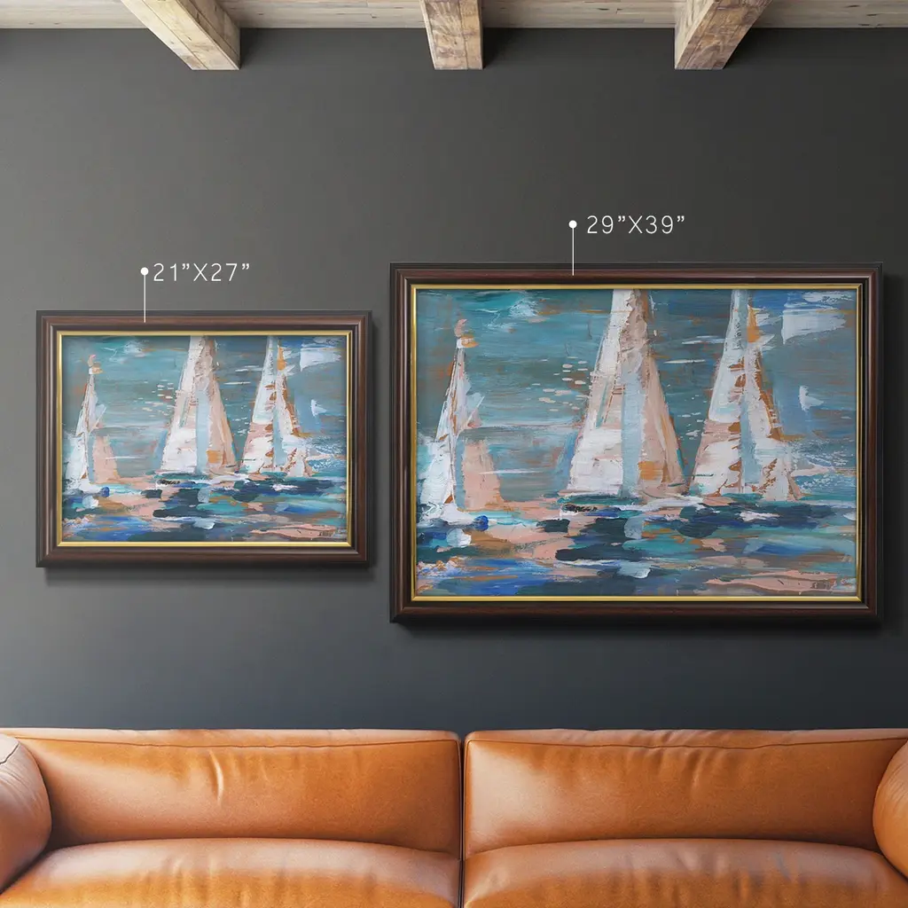 Pop Regatta II Premium Framed Canvas- Ready to Hang A Premium Framed Canvas created to last. Framed in distressed wood and available in an array of sizes and colors Featuring a beveled a solid wood stretcher bar, each piece comes ready to hand 3 SIZES AVAILABLE 16''X20'' - Overall Size 18'X27'' - Overall Size 24''x36'' - Overall Size Each piece is made to order. Each piece comes with hanging hardware. Made in the USA Ready to Hang Giclee Paper Print Acrylic Glass Beveled Matt Board