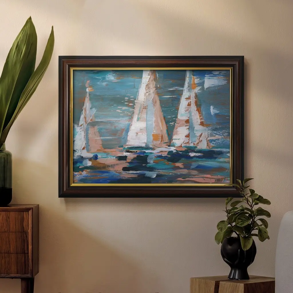 Pop Regatta II Premium Framed Canvas- Ready to Hang A Premium Framed Canvas created to last. Framed in distressed wood and available in an array of sizes and colors Featuring a beveled a solid wood stretcher bar, each piece comes ready to hand 3 SIZES AVAILABLE 16''X20'' - Overall Size 18'X27'' - Overall Size 24''x36'' - Overall Size Each piece is made to order. Each piece comes with hanging hardware. Made in the USA Ready to Hang Giclee Paper Print Acrylic Glass Beveled Matt Board