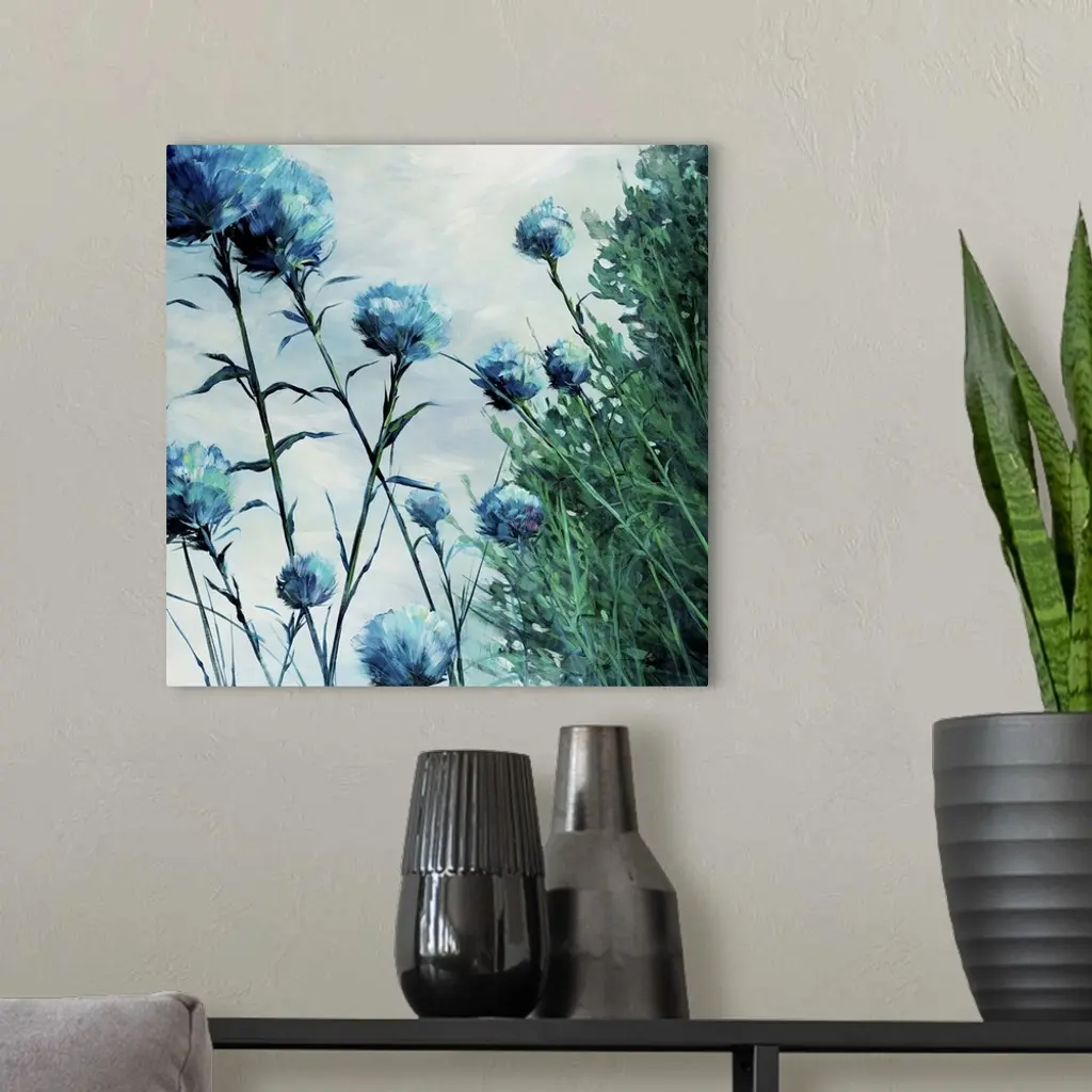 Floral painting in cool tones of a cluster of round puffy flowers on long stems next to a cluster of green grasses, beneath a light cloudy sky.