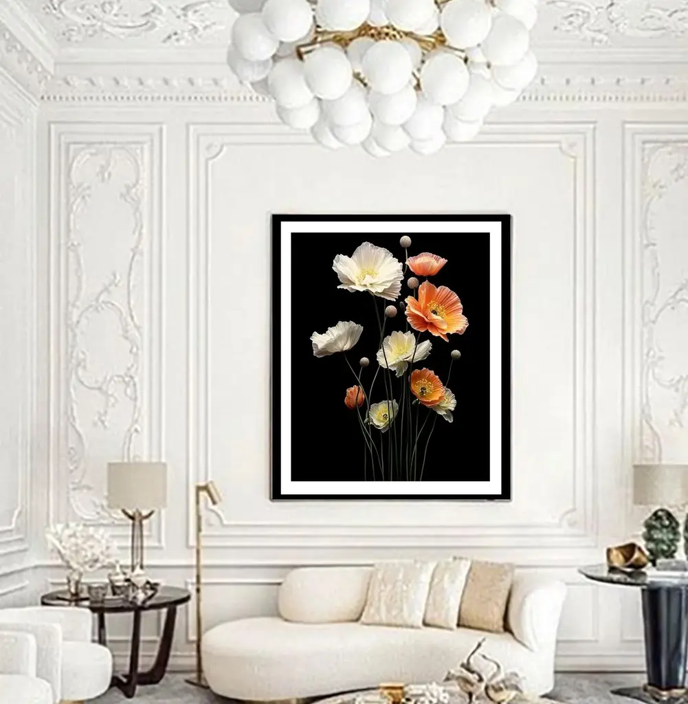 This photograph showcases a bouquet of delicate, vibrant poppies in various shades of orange, purple, yellow, and pink, set against a dark background. The flowers have thin, elegant stems that create a natural and organic flow to the composition. The lighting is soft, highlighting the intricate details of the petals, which have a paper-like texture with subtle veins. This contrast between the vivid colors of the poppies and the dark backdrop makes each flower stand out, creating a stunning and graceful arrangement. Printed on 300 gsm Archival Fine Art Paper.