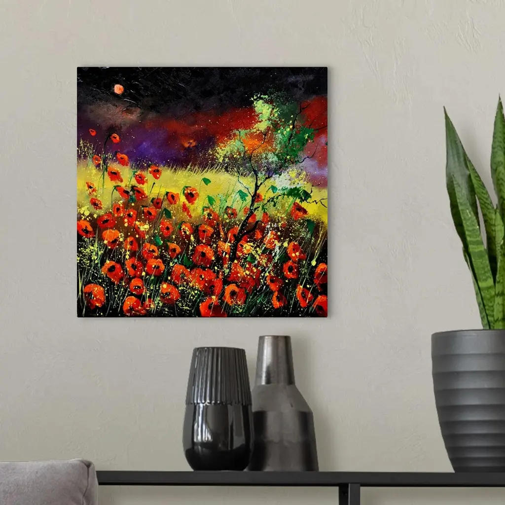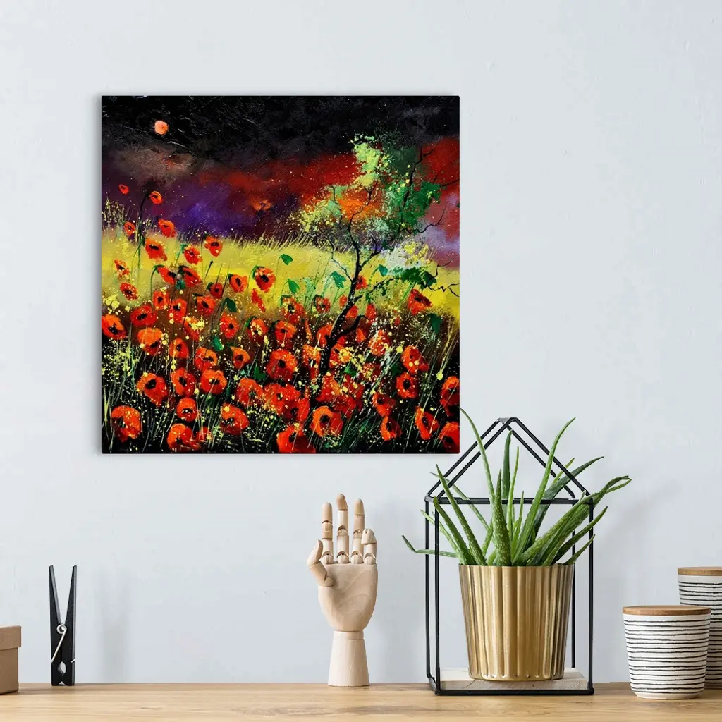 Vibrant painting of red poppies in a filed with a dark, red sky in the distance.