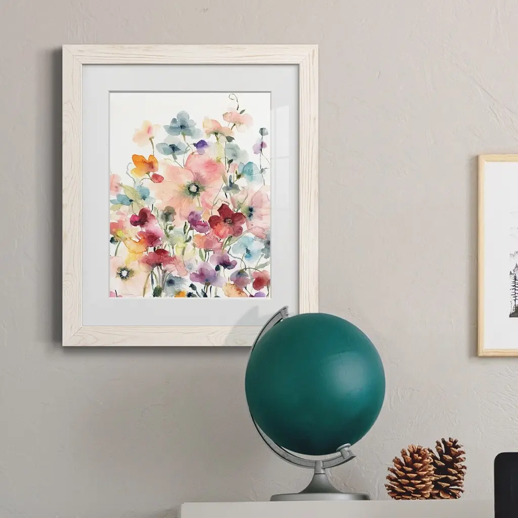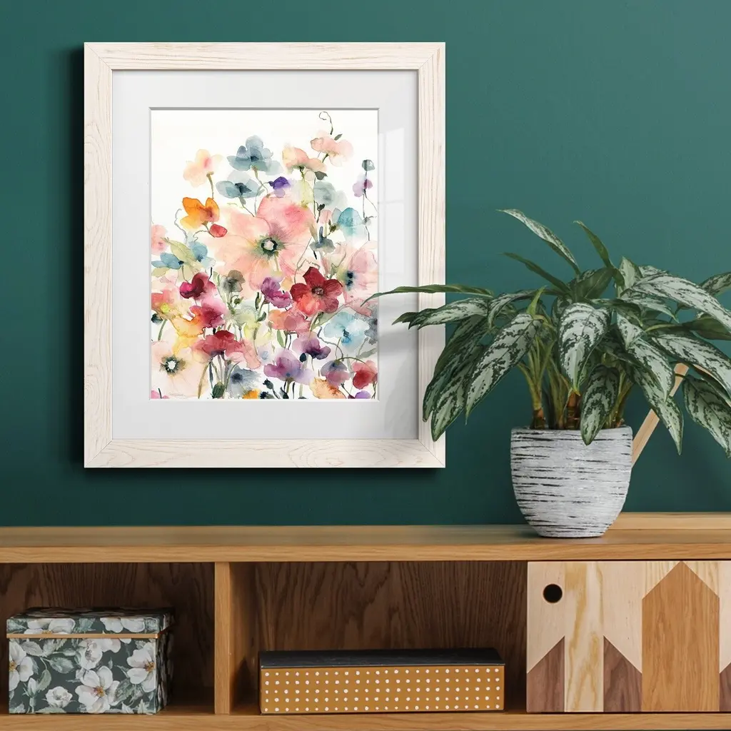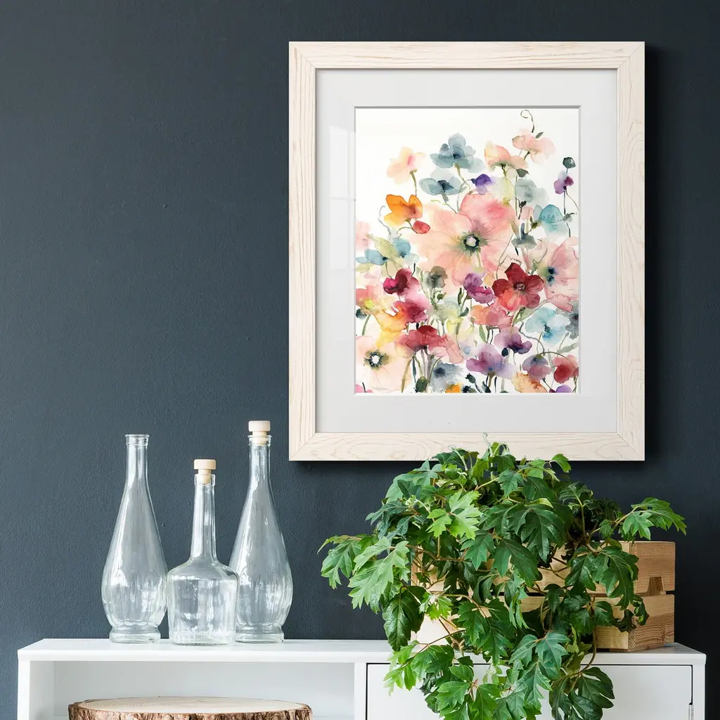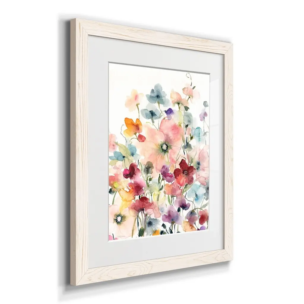Poppies and Sweetpeas-Premium Framed Print - Ready to Hang Framed in distressed wood and available in an array of sizes and colors Each piece is joined and assembled by hand and comes ready to hang 2 INCH BEVELED MATTE BOARD PLEXIGLASS COVERING READY TO HANG MADE IN THE USA SOLID WOOD FRAME MADE IN USA FADE RESISTANT GICLEE PRINTING on Canvas or Paper