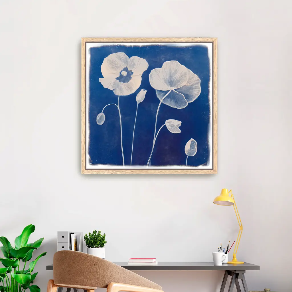 Introduce a touch of elegance to your home with"Poppies" canvas art by Aeious Plata. Featuring delicate blue flowers beautifully rendered in elegant detail, this artwork adds a sophisticated and serene touch to any room. The calming blue hues create a peaceful atmosphere, making it a perfect addition to both modern and classic interiors. Available in black frame, dark walnut frame, oak frame, or as a wrapped canvas. Our Gallery Wrap Canvas Prints are proudly assembled with high quality materials in California, USA. Each piece is printed on a thick, archival grade canvas using Giclee technology. It is then hand-stretched by our experienced artisans over solid wood bars, which will not warp over time. The final product is a piece personally crafted for you to confidently display on your wall. Care and Assembly: Ensure that the location of your piece has little to no exposure to heat, sunlight, and moisture. Wipe clean, only if needed. Each piece includes a sawtooth hanger to hang on your wall horizontally.