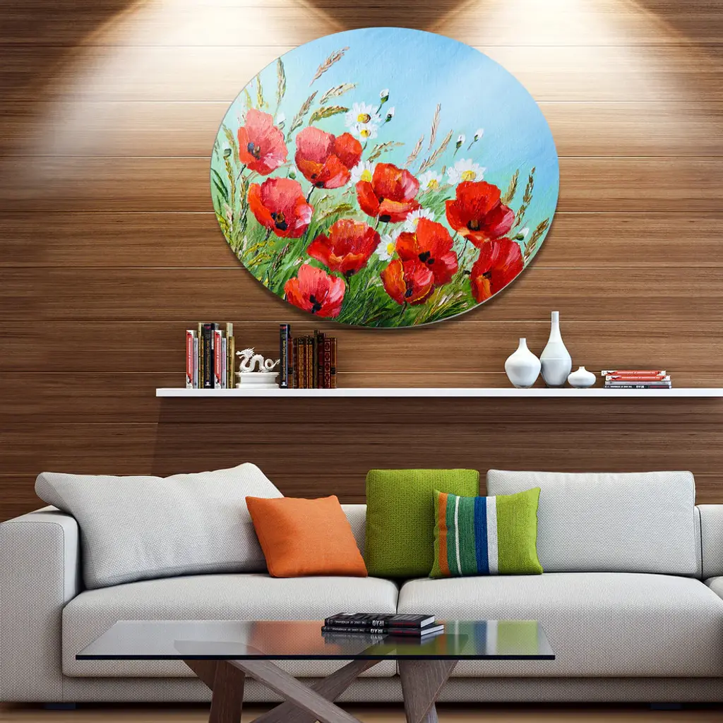 Bring Contemporary Abstraction to your home with this large Circle Metal wall art. This Poppies in Field against Blue Sky Metal Artwork makes it the focal point of any room or office. - White Gloss Coating ensures colors are extra vibrant with light reflection.- Aluminum grade Sheet Metal with 1 inch mounting frame on the back giving the illusion that the artwork is floating on the wall..- Mounting Brackets are included along with instructions.- High Quality Digital images are created directly into a glossy aluminum panel producing a stunning and captivating print into the glossy finish of the metal.- Water, Fire and Scratch resistant HD Aluminum panels.- Looks better than any photo paper and guaranteed to last at least 20 years- Easy to clean with a microfiber cloth. Colors are far superior to regular Canvas Art. - Easy to Hang