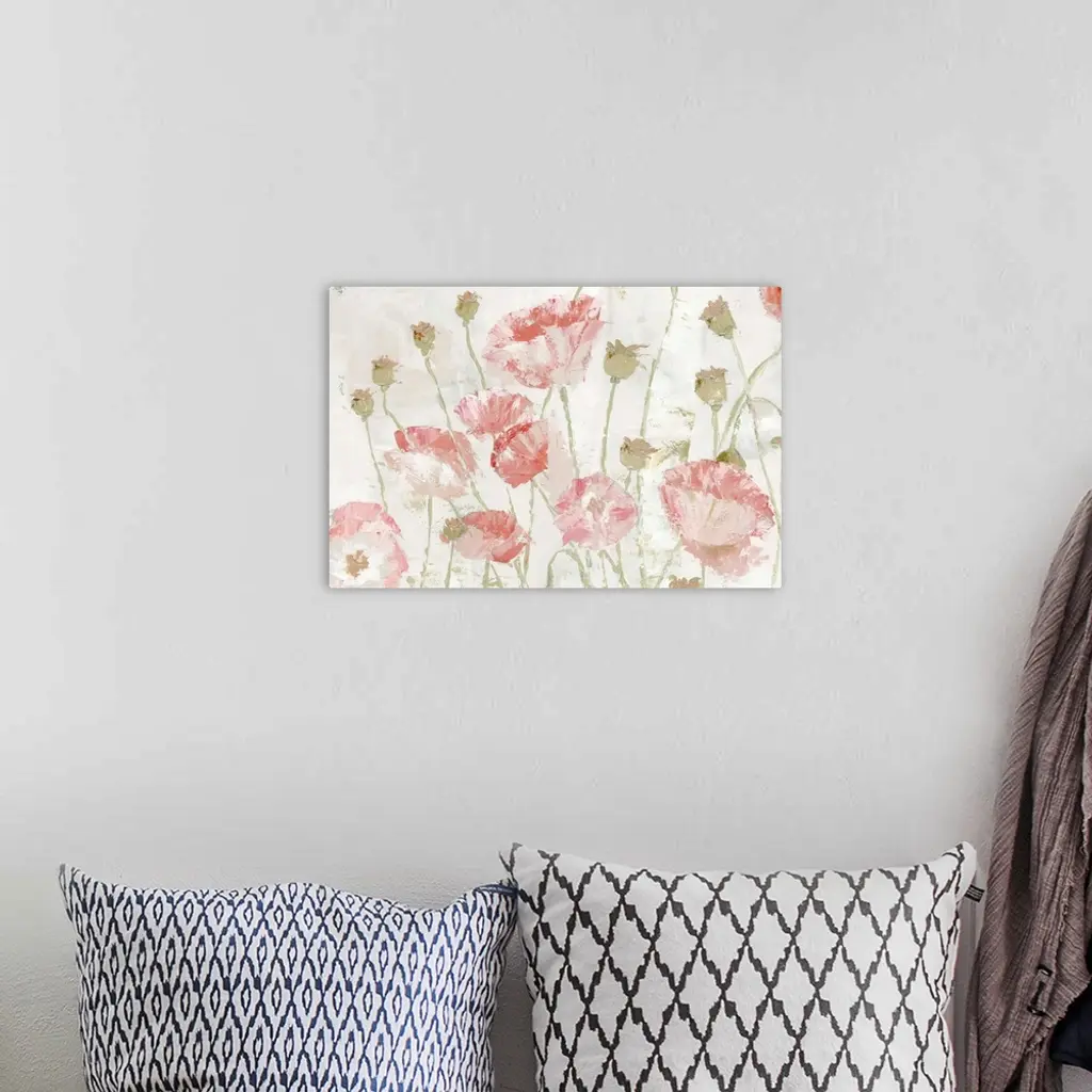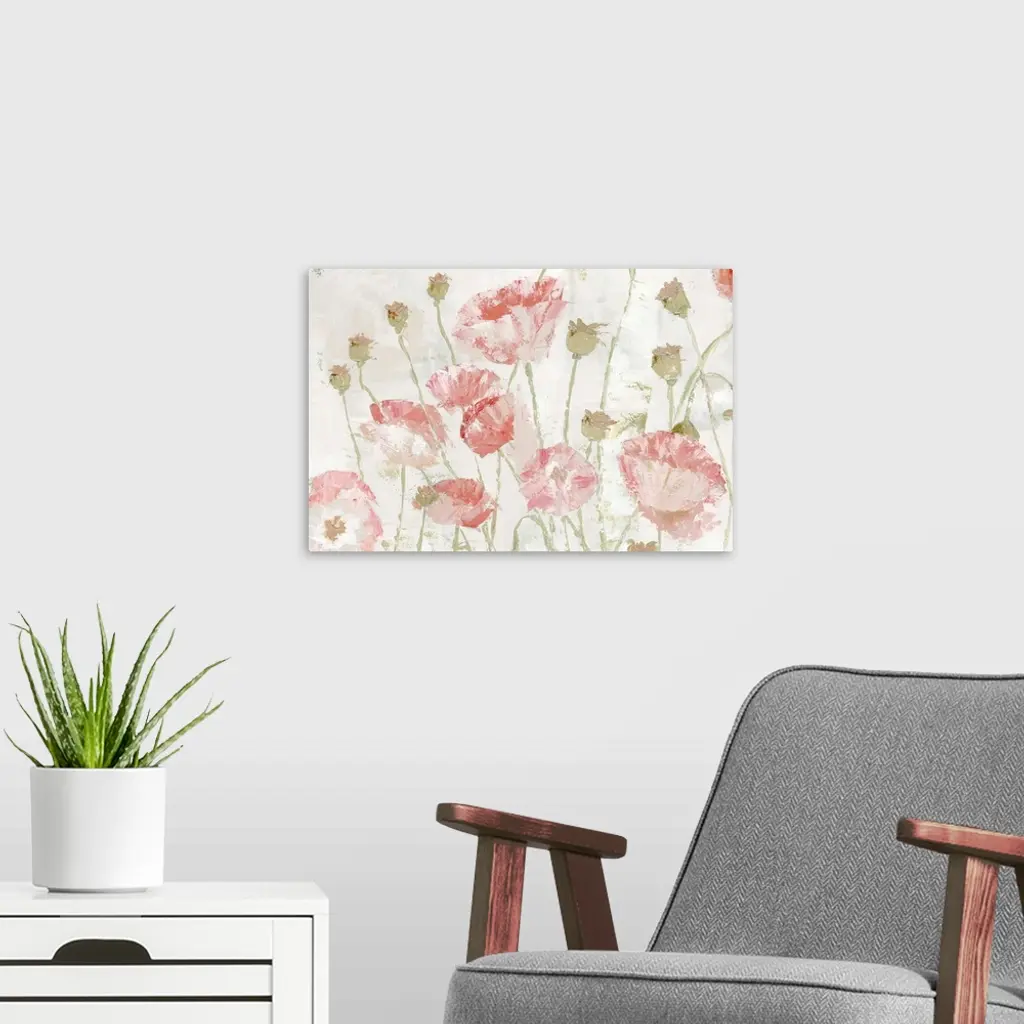 Contemporary painting of a group of red poppies in faded tones on a neutral backdrop.
