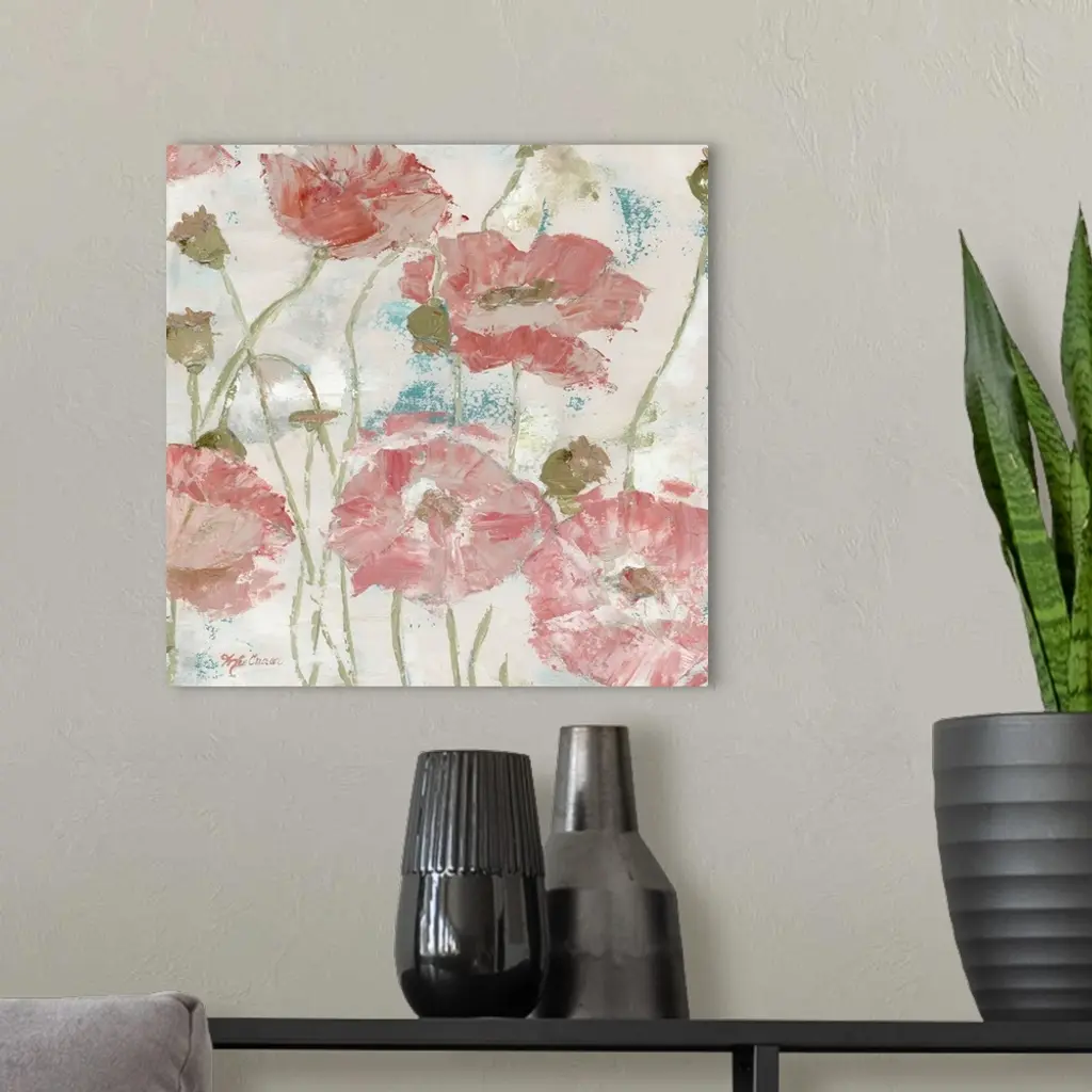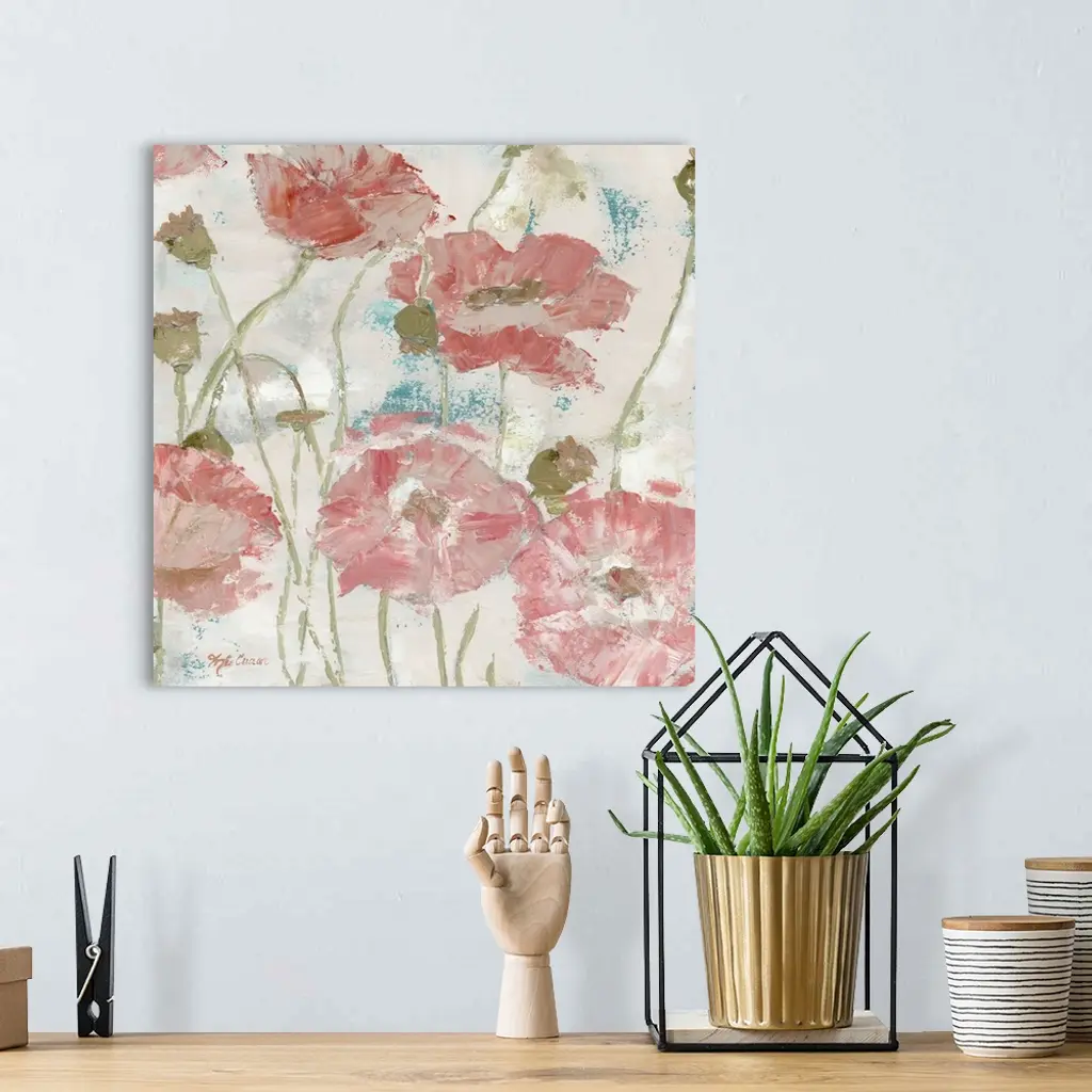 Contemporary painting of a group of red poppies in faded tones on a neutral backdrop.