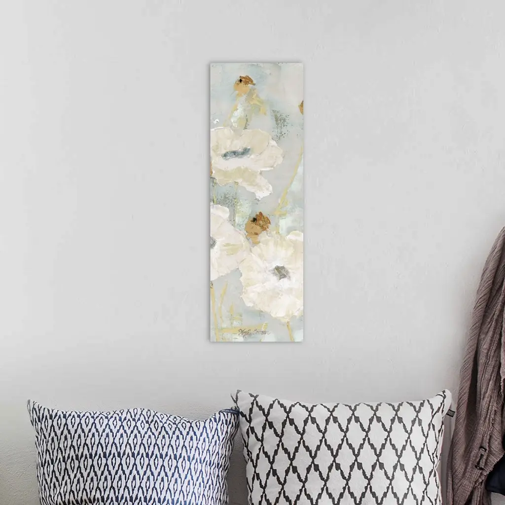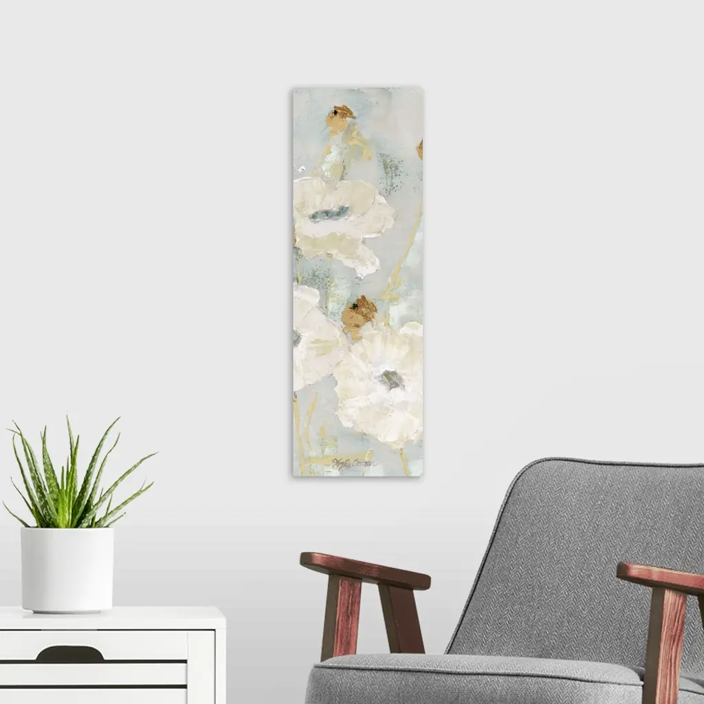 Contemporary painting of a group of white poppies on a muted gray backdrop.
