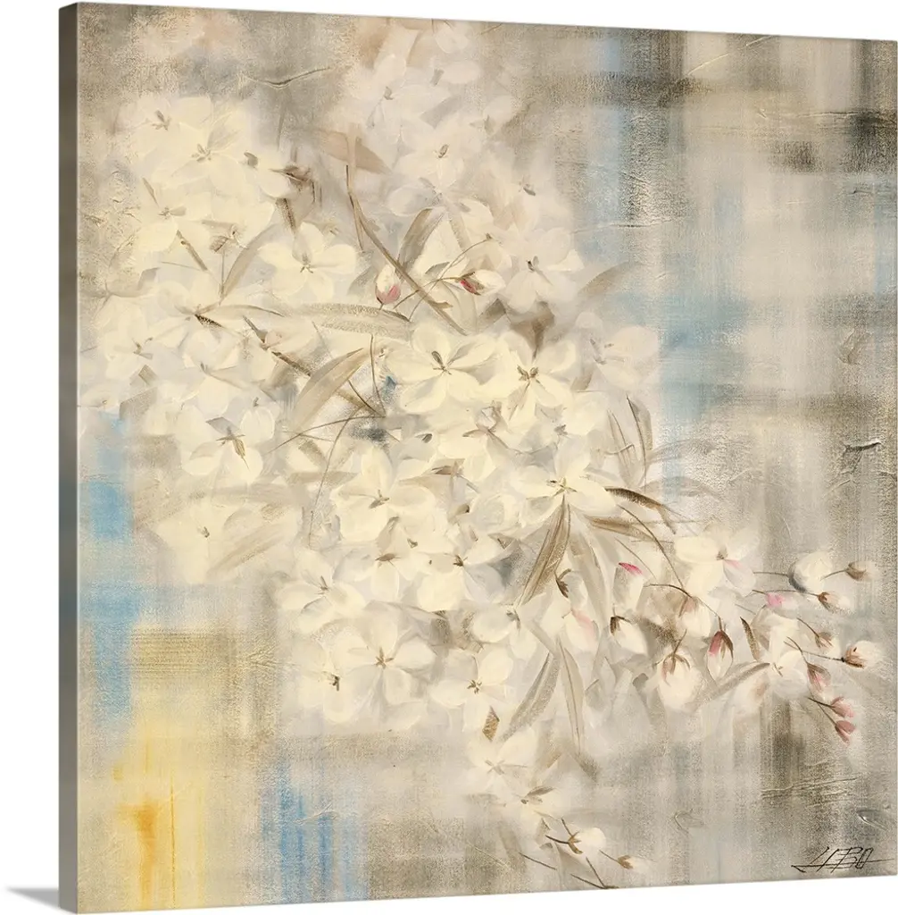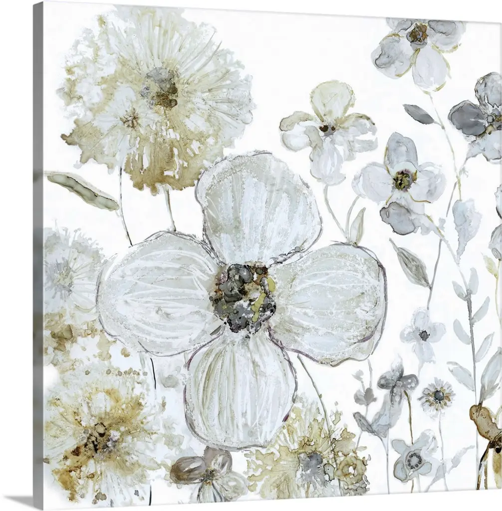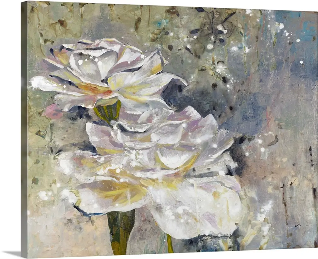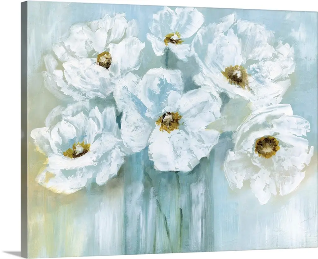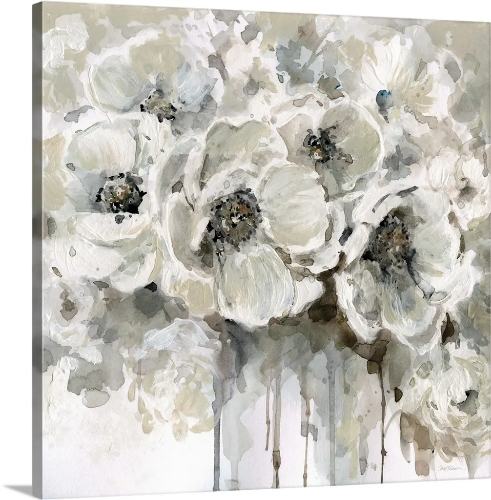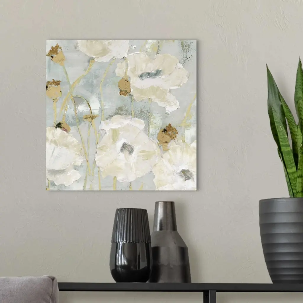 Contemporary painting of a group of white poppies on a muted gray backdrop.