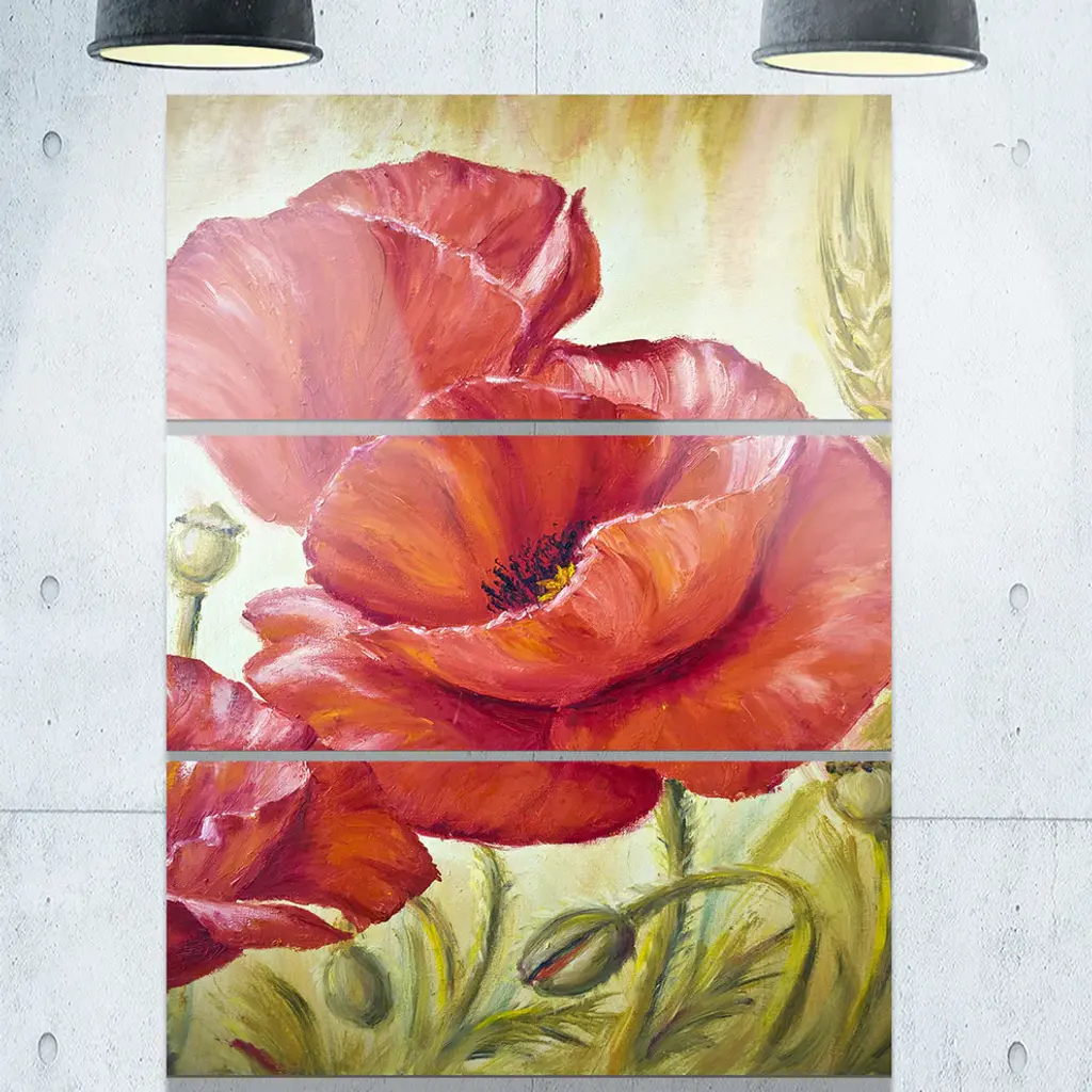 "Poppies In Wheat" Glossy Metal Wall Art, 3 Panels, 28"x36"