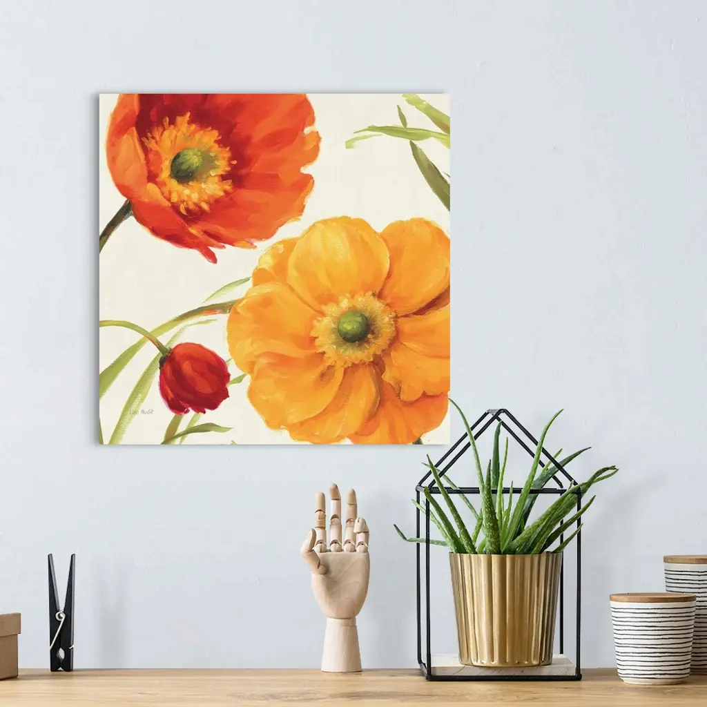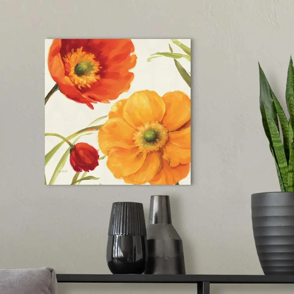 Contemporary artwork of a close-up of bright poppy flowers.