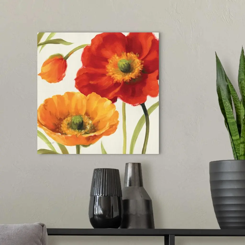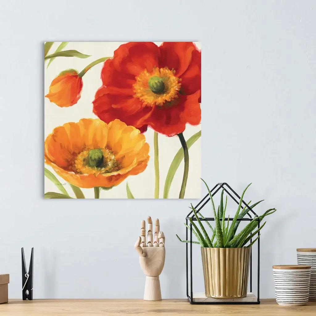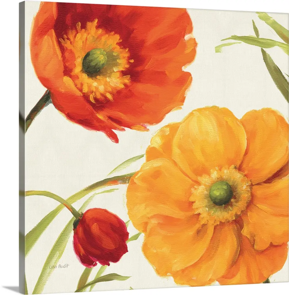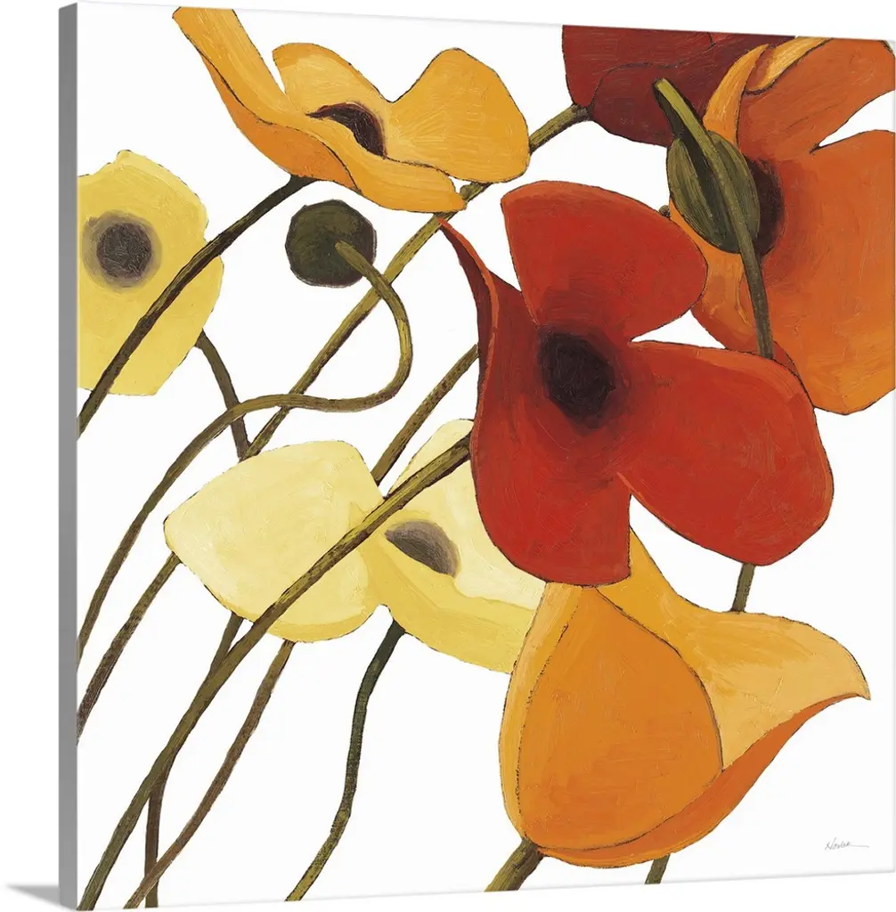 Contemporary artwork of a close-up of bright poppy flowers.