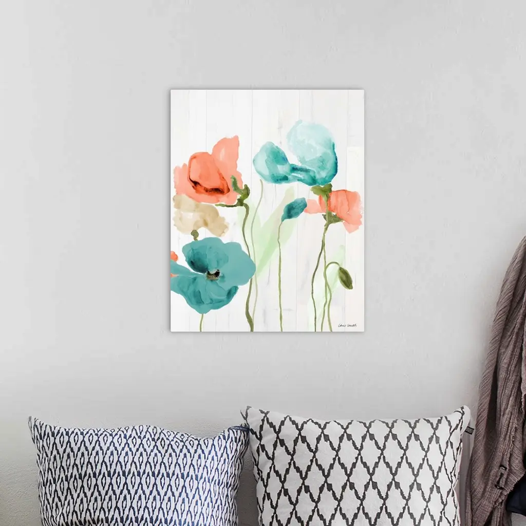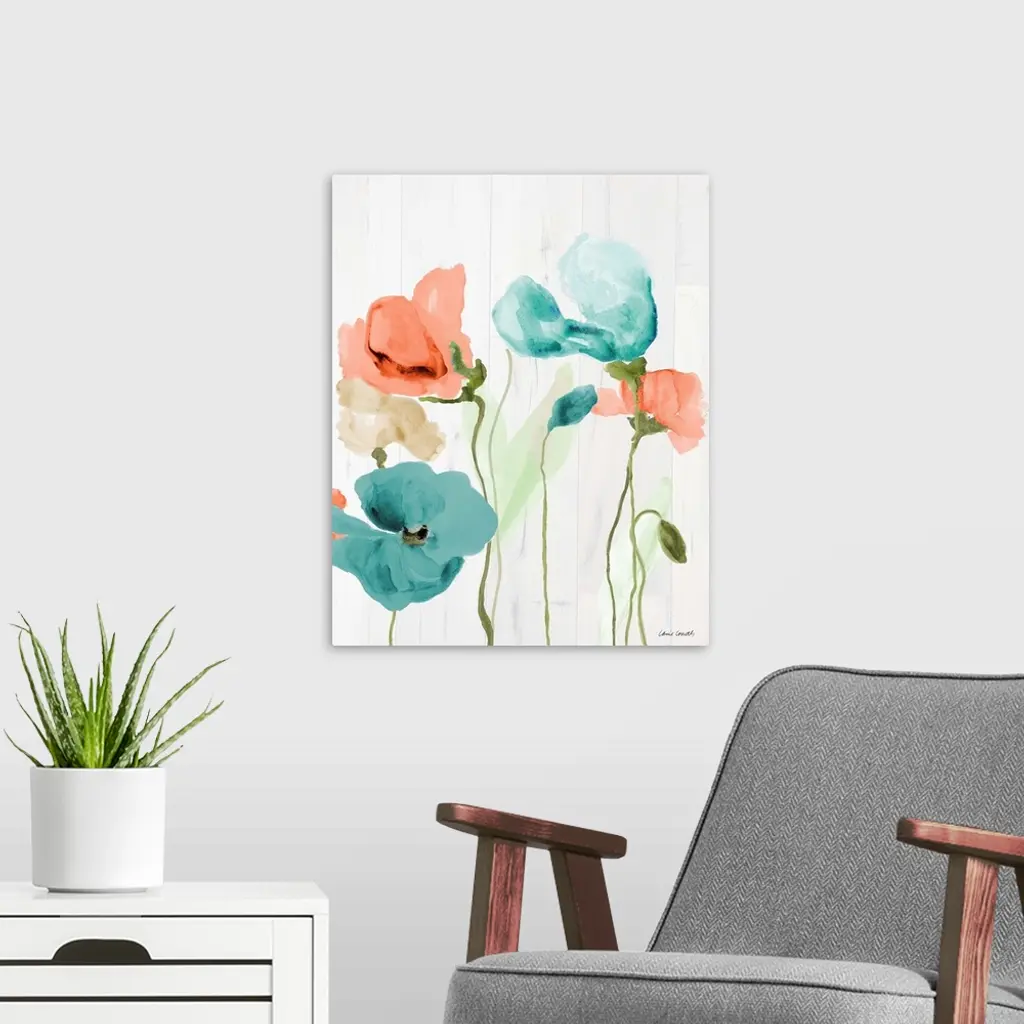 Contemporary watercolor painting of blue and orange poppy flowers on a rustic white wood paneled background.
