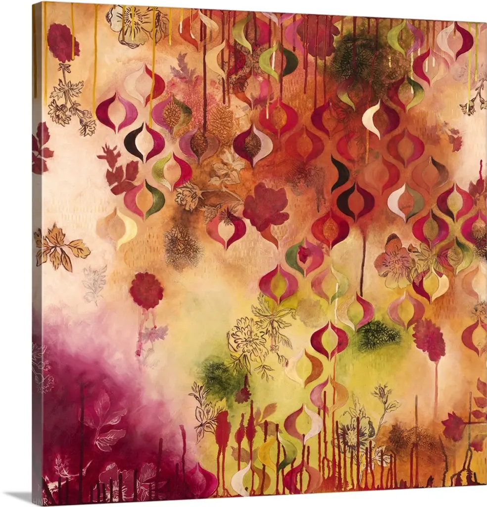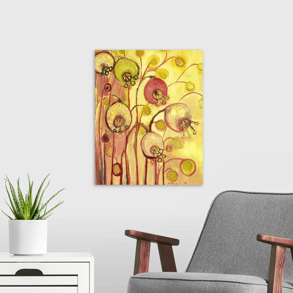 Contemporary, abstract, and whimsical painting of flowers and buds.