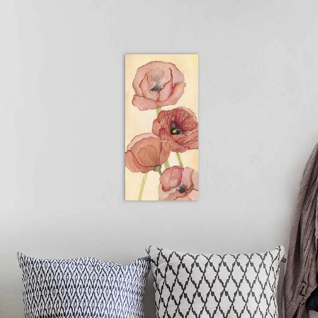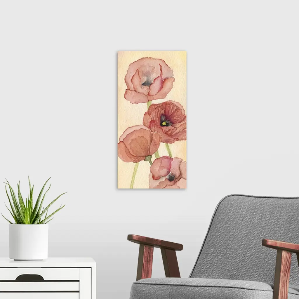 An elegant watercolor painting of red poppies on a warm tone backdrop.