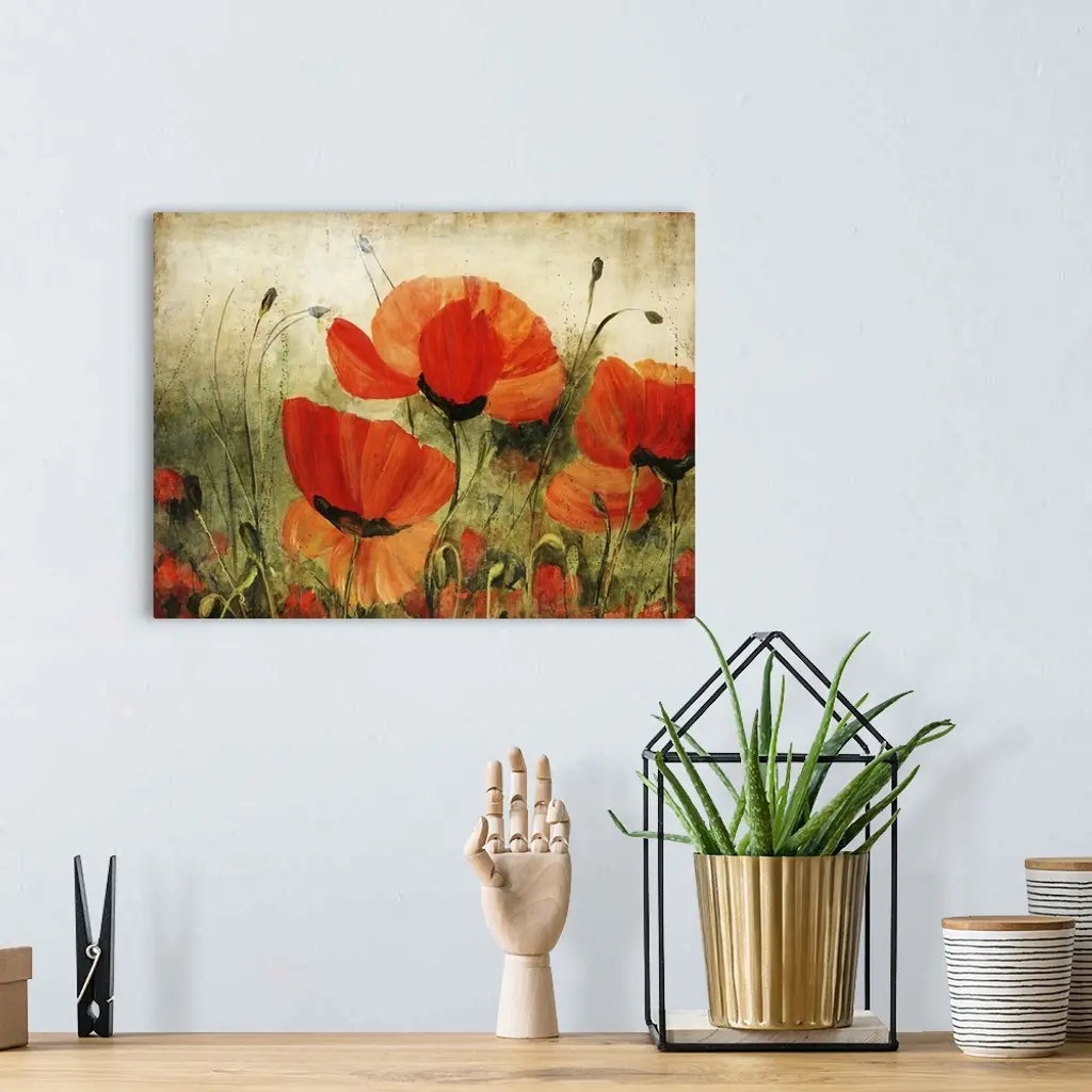 Contemporary artwork of delicate painted poppy flowers against a rustic background.