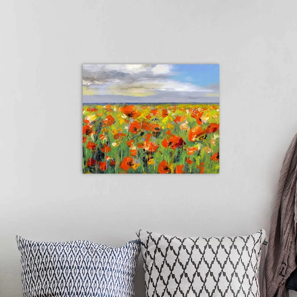 This decorative wall art is a horizontal painting with an endless landscape of wildflowers and clouds gliding over the horizon.