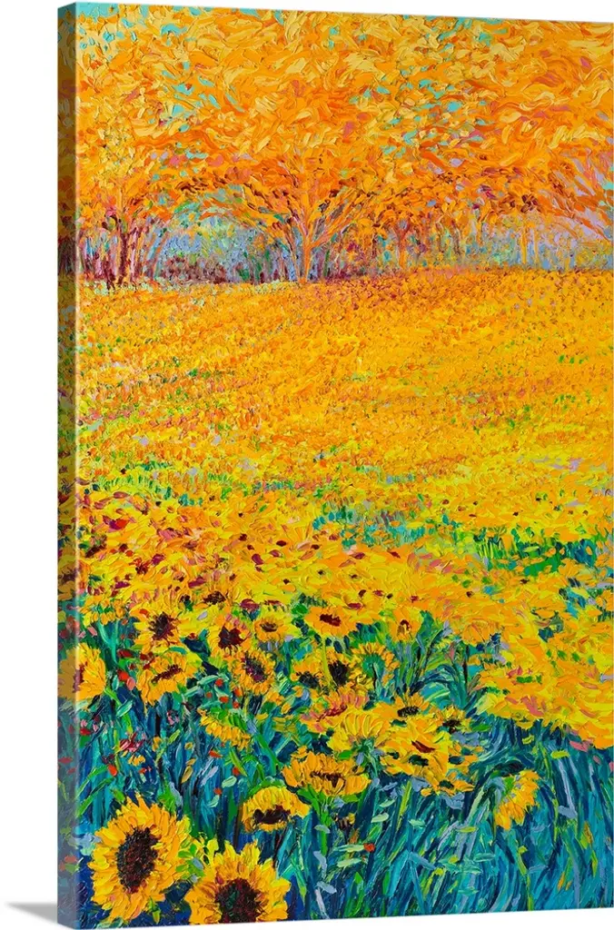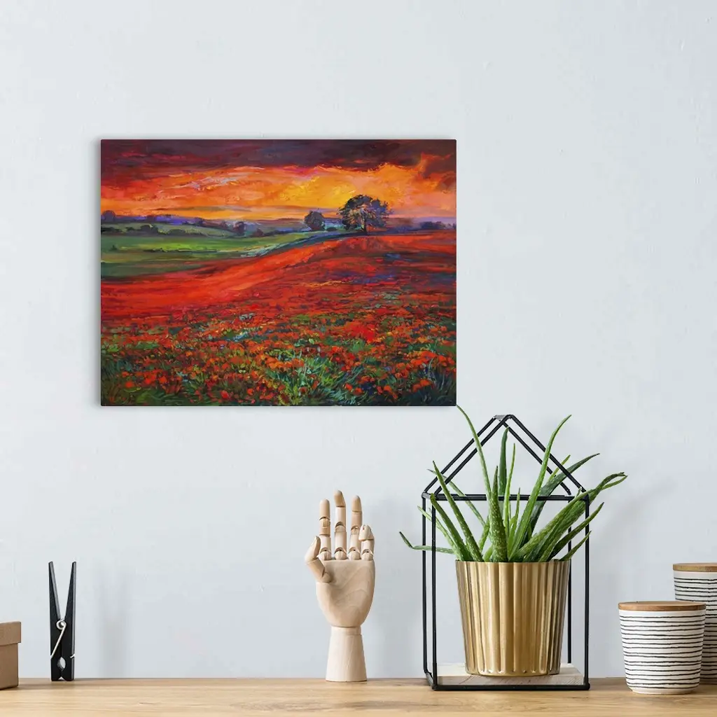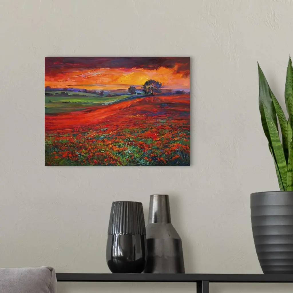 Originally an oil painting of opium poppy (Papaver Somniferum) field in front of beautiful sunset on canvas. Modern impressionism.
