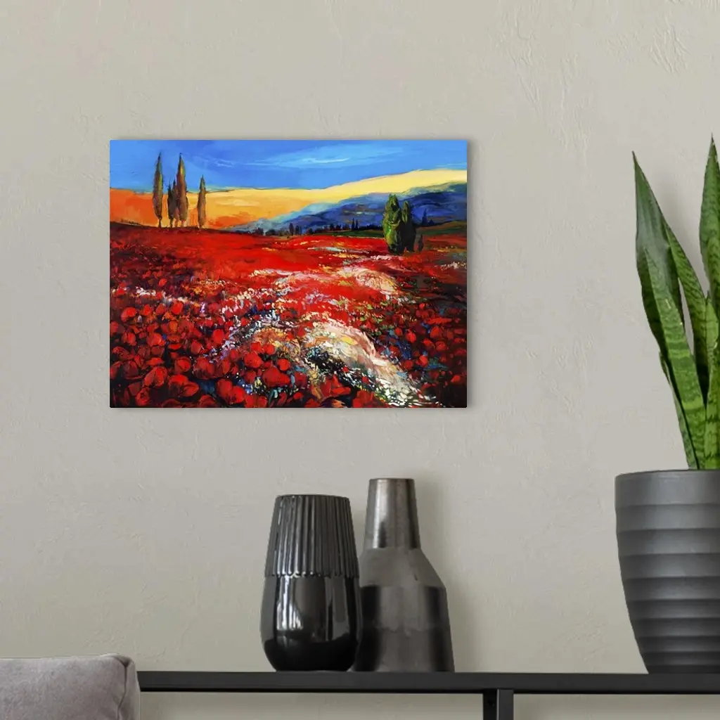 Originally an oil painting of opium poppy (Papaver Somniferum) field in front of beautiful sunset on canvas. Modern impressionism.