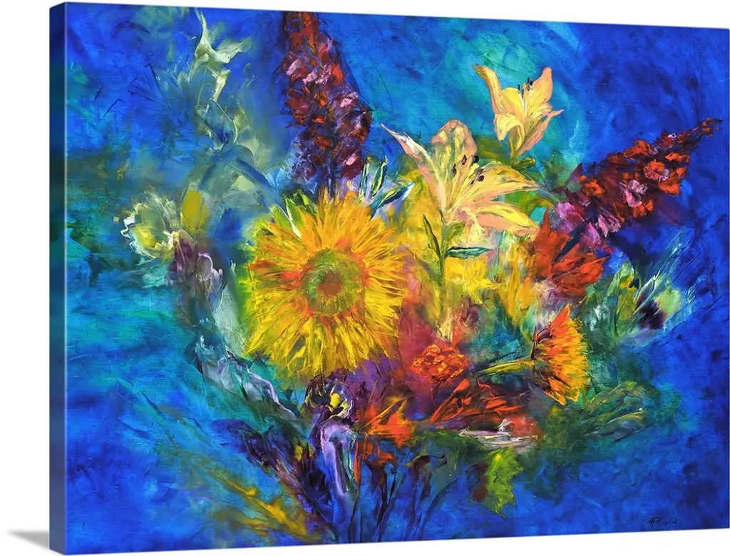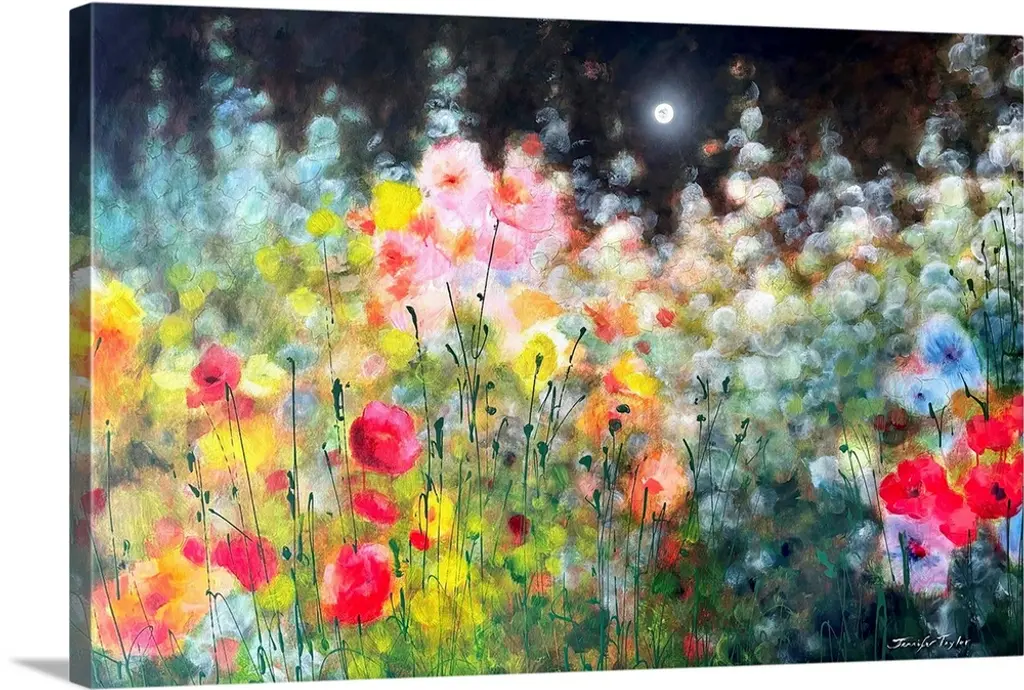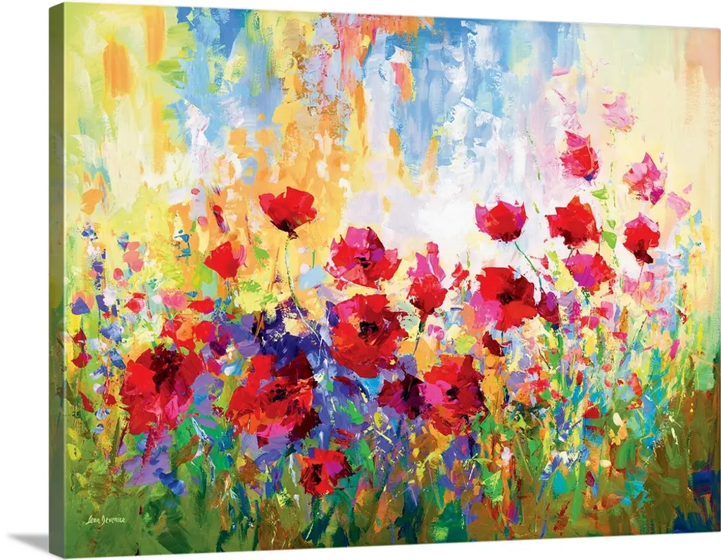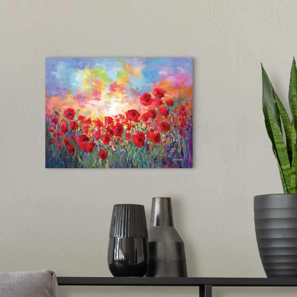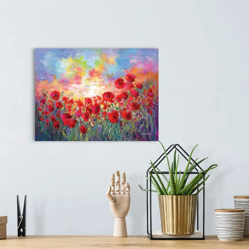 Vibrant red poppies glow in this modern contemporary painting. The impressionistic brushstrokes capture the beauty of poppy fields in California.