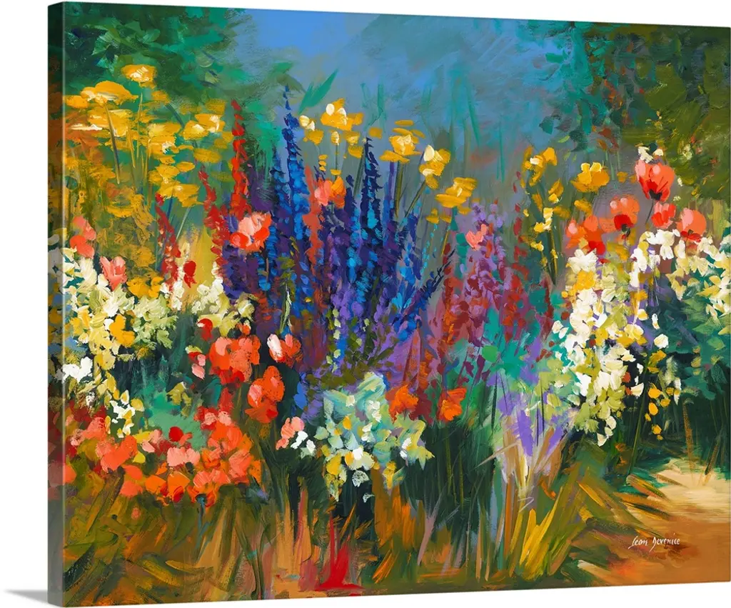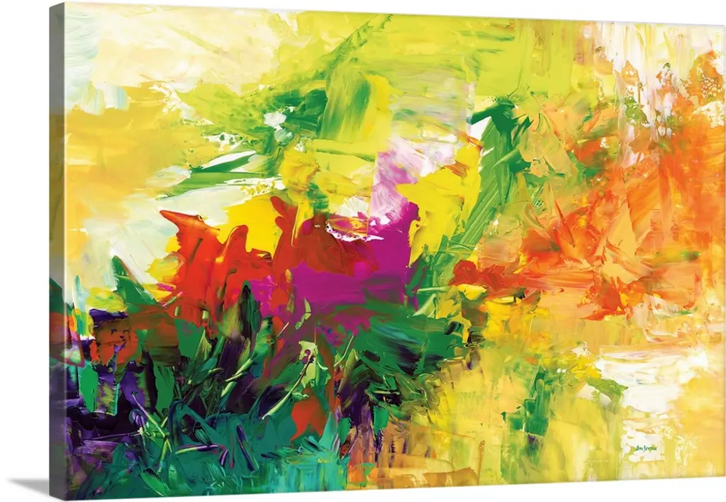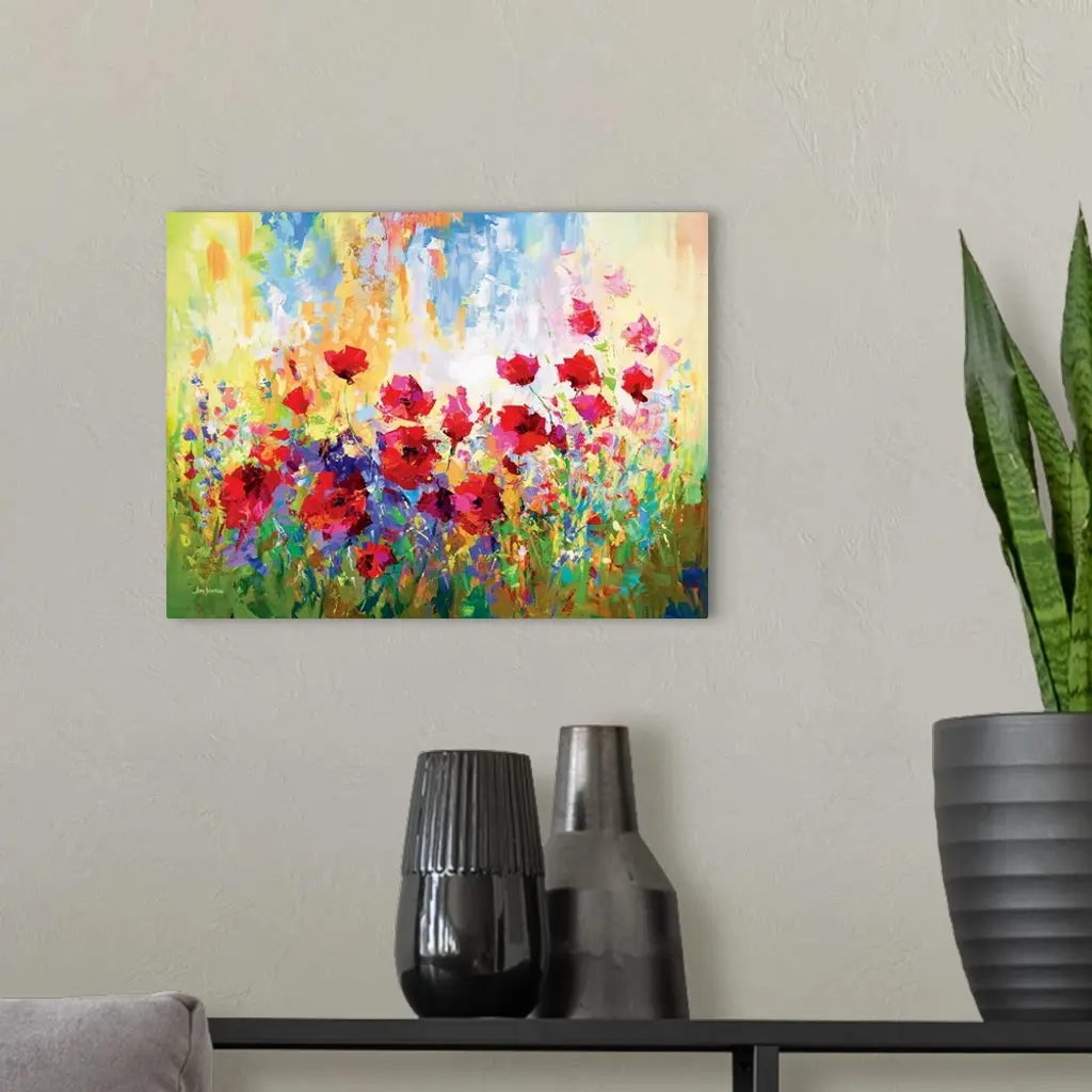 Contemporary painting of a vibrant poppy field. The red petals contrast beautifully against the colorful abstract blooms. The brush strokes are loose and impressionistic, creating abstract patterns across the painting.