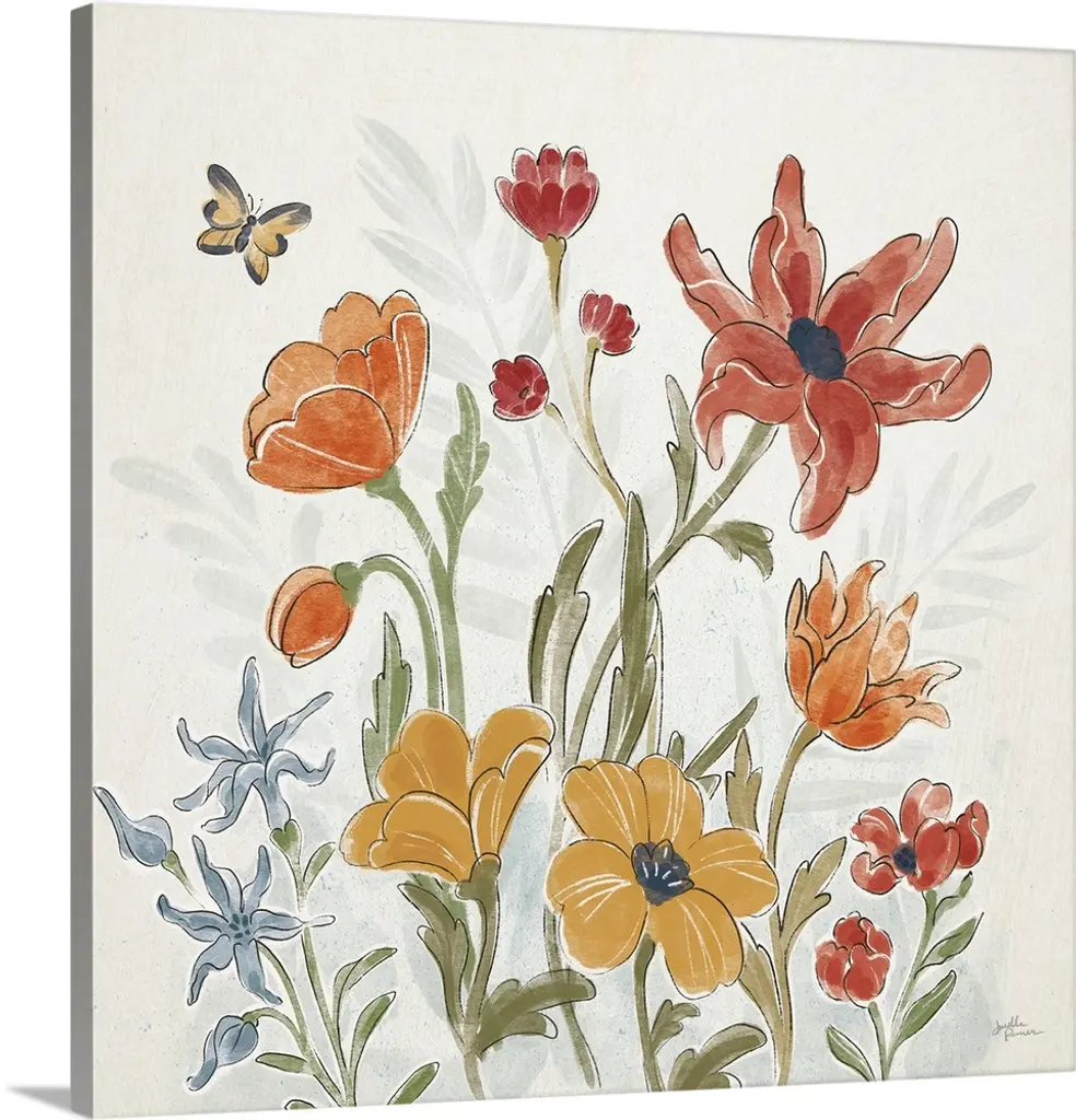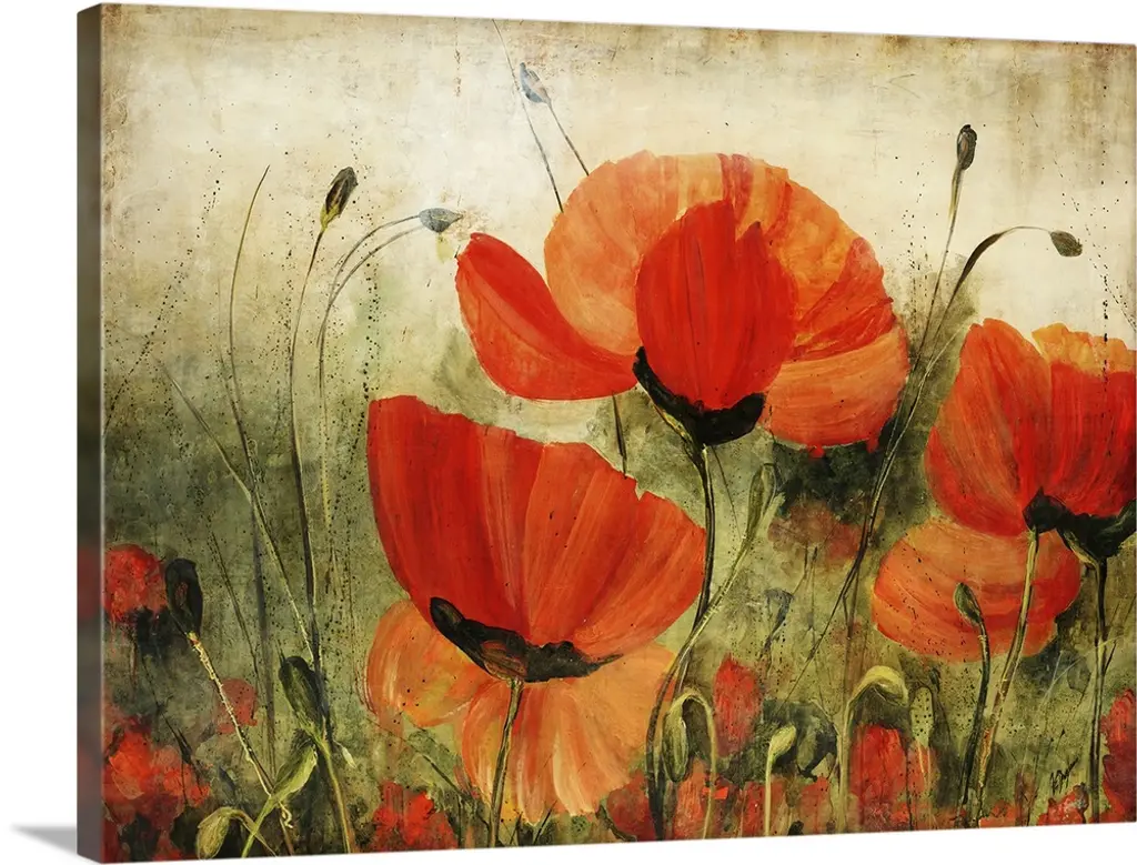 Asian style artwork of a garden of red, pink, and orange poppies.