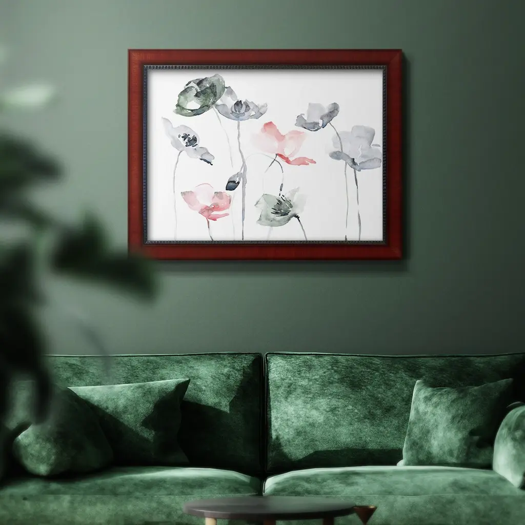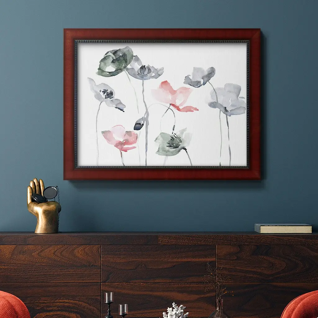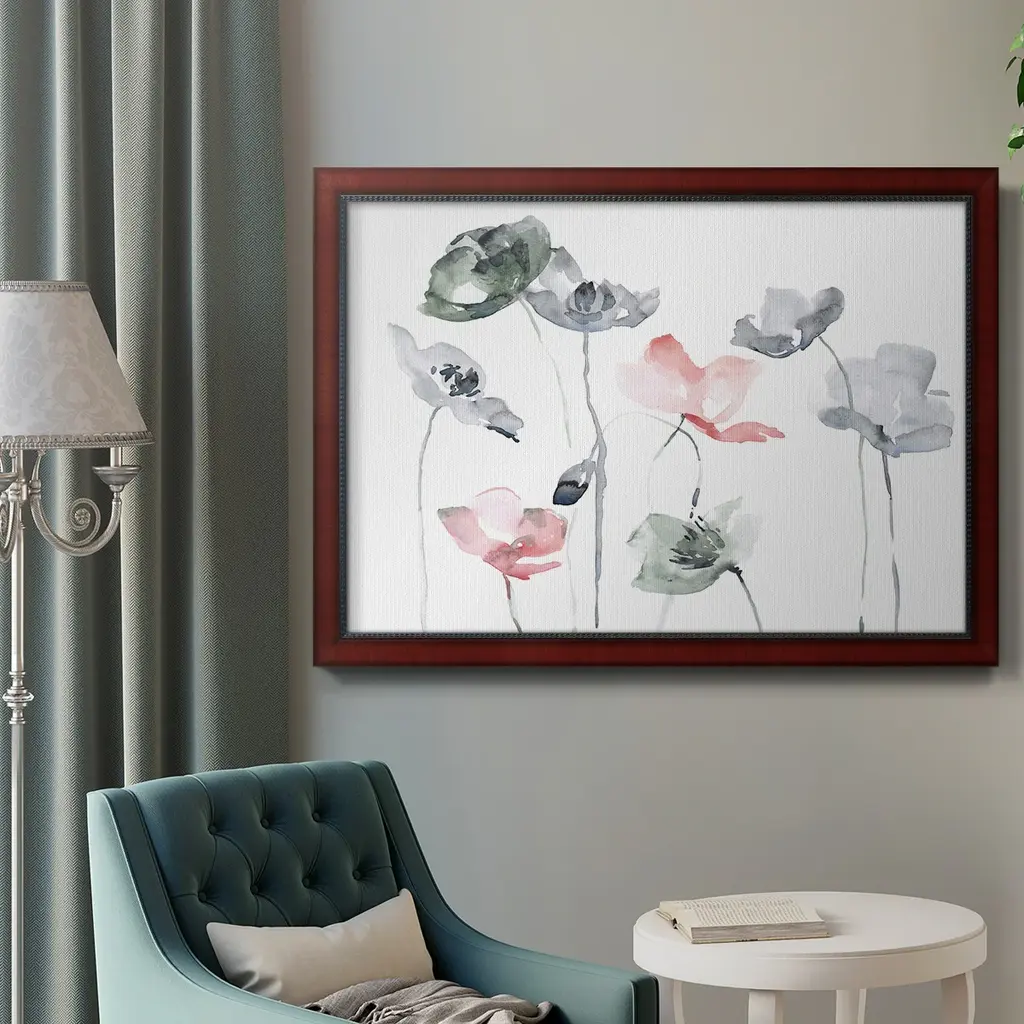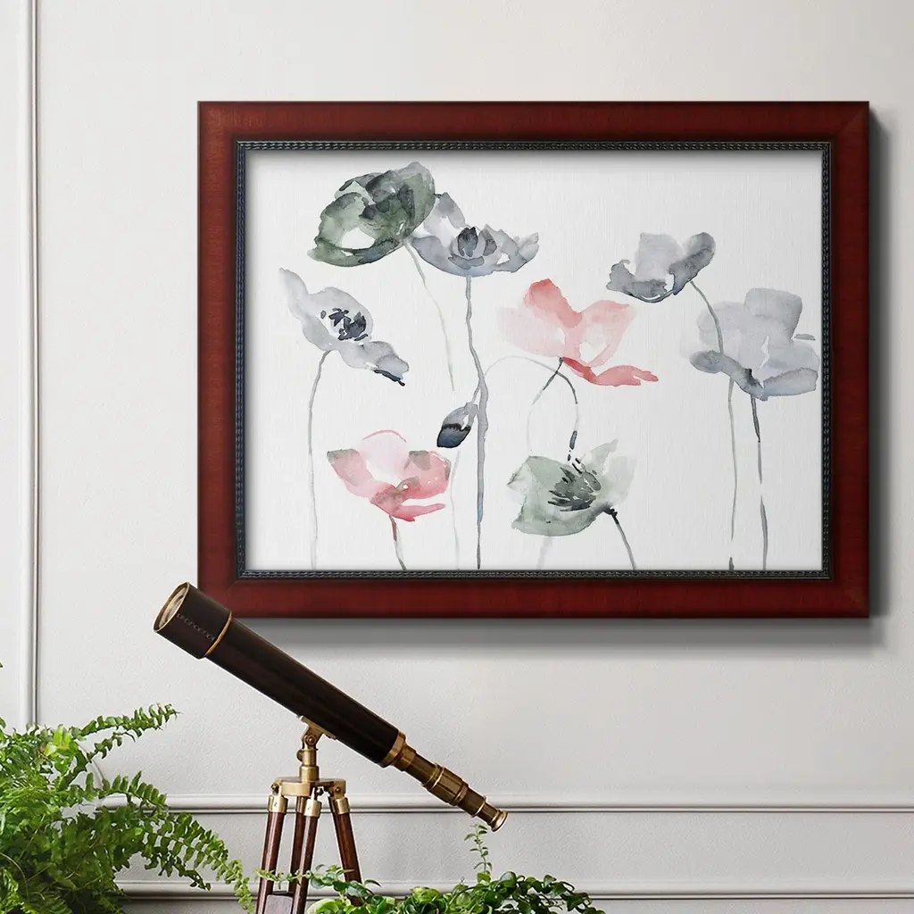 Poppy Haze II Premium Framed Canvas- Ready to Hang A Premium Framed Canvas created to last. Framed in distressed wood and available in an array of sizes and colors Featuring a beveled a solid wood stretcher bar, each piece comes ready to hand 3 SIZES AVAILABLE 16''X20'' - Overall Size 18'X27'' - Overall Size 24''x36'' - Overall Size Each piece is made to order. Each piece comes with hanging hardware. Made in the USA Ready to Hang Giclee Paper Print Acrylic Glass Beveled Matt Board