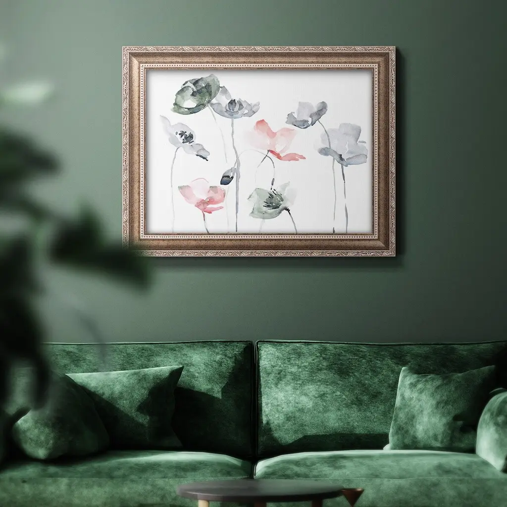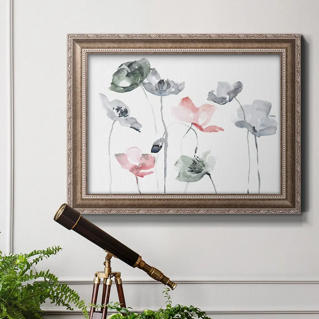 Poppy Haze II Premium Framed Canvas- Ready to Hang A Premium Framed Canvas created to last. Framed in distressed wood and available in an array of sizes and colors Featuring a beveled a solid wood stretcher bar, each piece comes ready to hand 3 SIZES AVAILABLE 16''X20'' - Overall Size 18'X27'' - Overall Size 24''x36'' - Overall Size Each piece is made to order. Each piece comes with hanging hardware. Made in the USA Ready to Hang Giclee Paper Print Acrylic Glass Beveled Matt Board