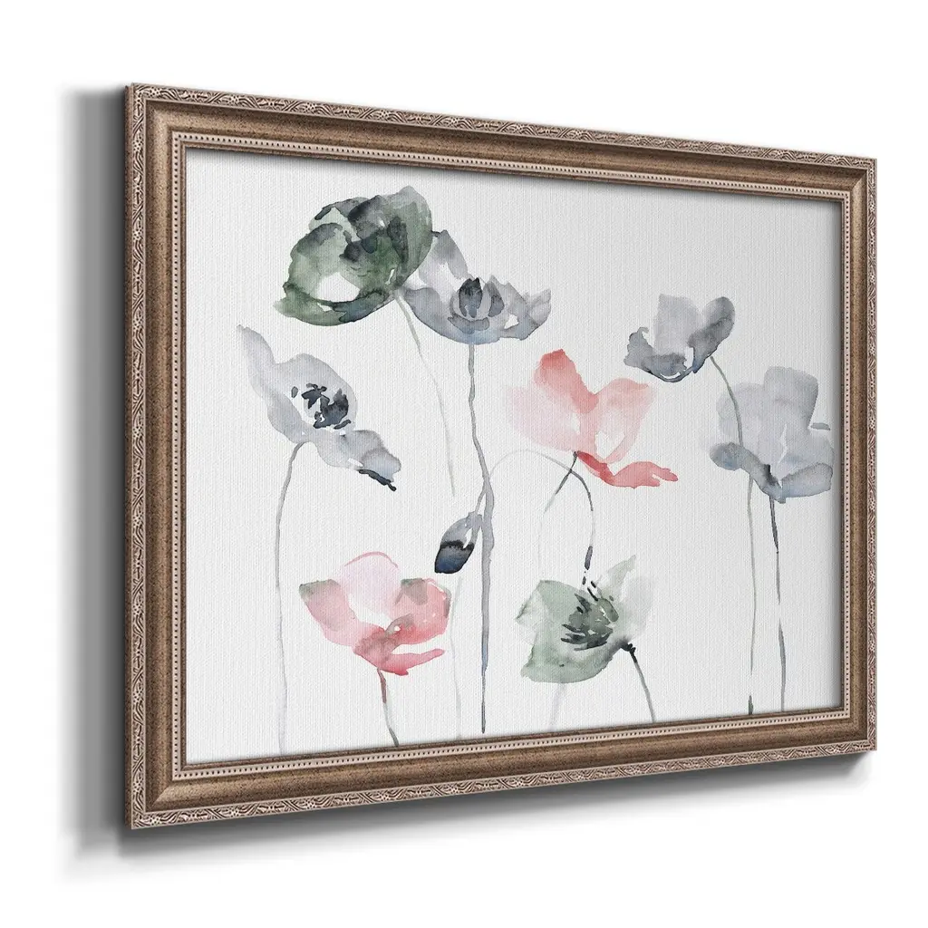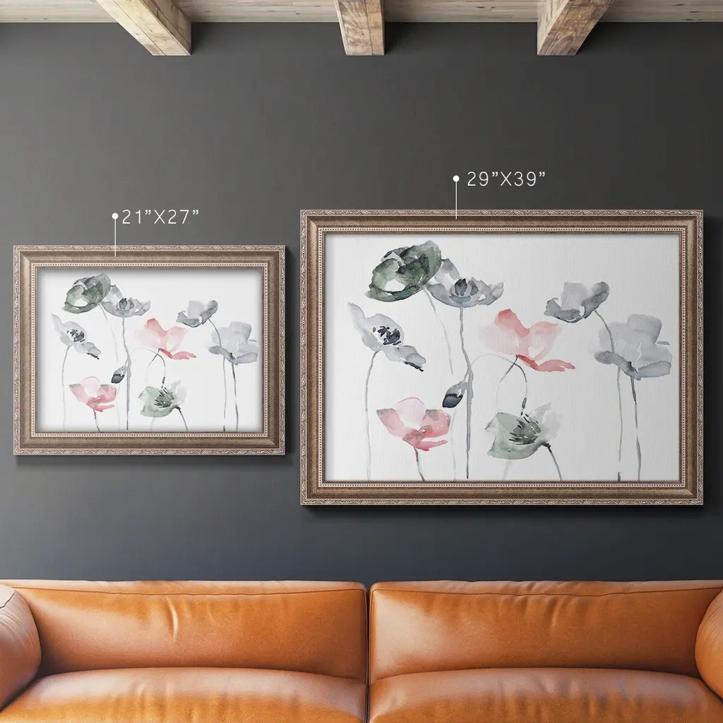 Poppy Haze II Premium Framed Canvas- Ready to Hang A Premium Framed Canvas created to last. Framed in distressed wood and available in an array of sizes and colors Featuring a beveled a solid wood stretcher bar, each piece comes ready to hand 3 SIZES AVAILABLE 16''X20'' - Overall Size 18'X27'' - Overall Size 24''x36'' - Overall Size Each piece is made to order. Each piece comes with hanging hardware. Made in the USA Ready to Hang Giclee Paper Print Acrylic Glass Beveled Matt Board