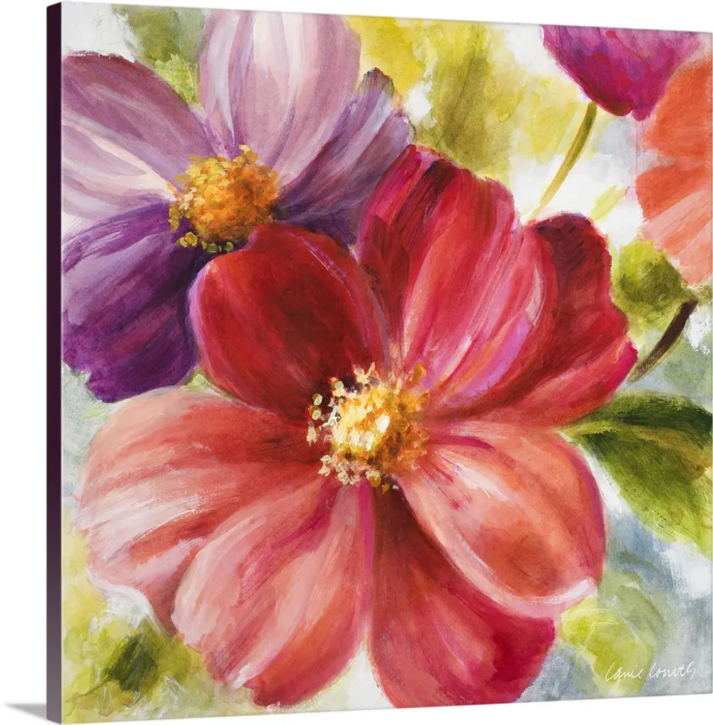Contemporary painting of three flowers viewed close up on canvas.