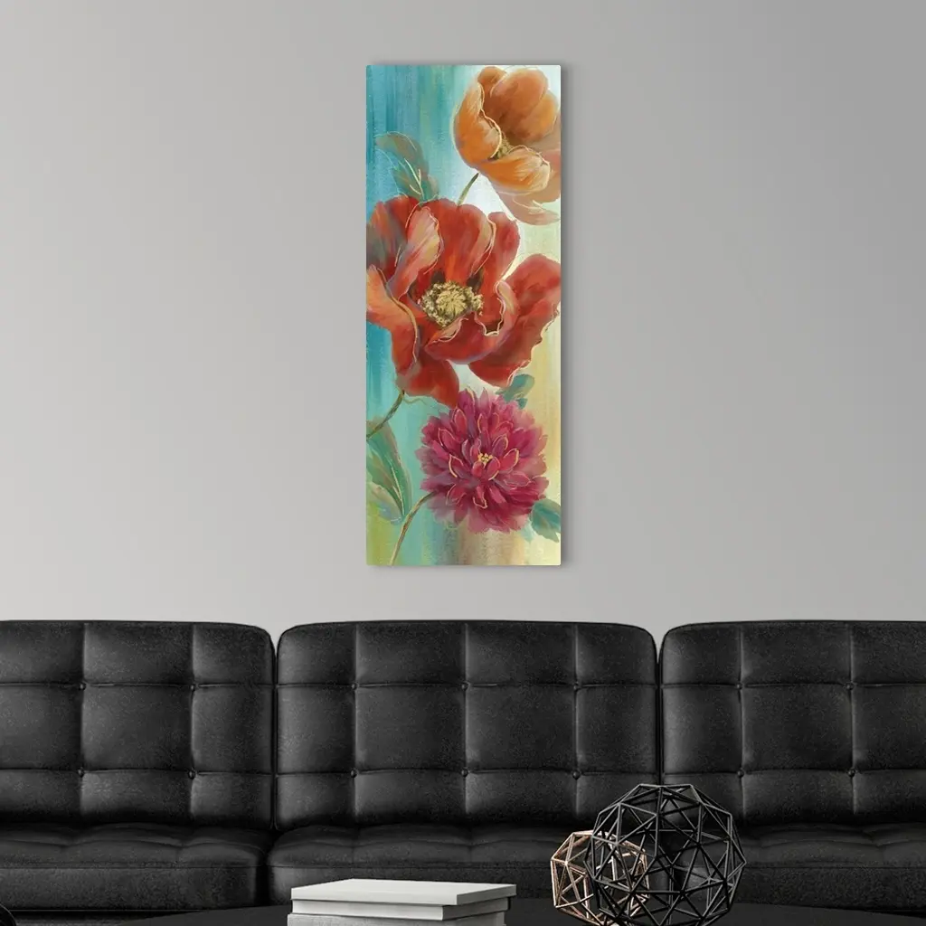 Large panel painting of poppy flowers in orange, red, pink, and purple with metallic gold outlines, on a blue and gold background.