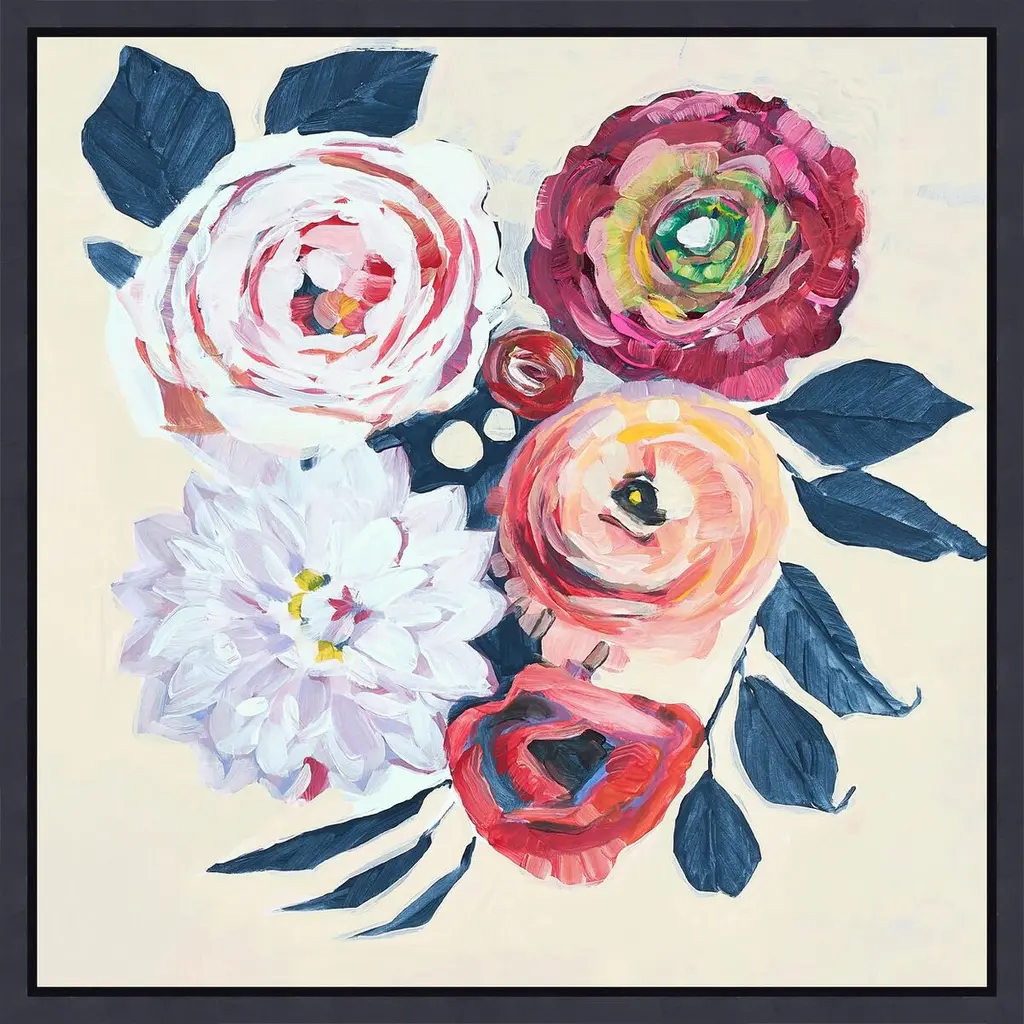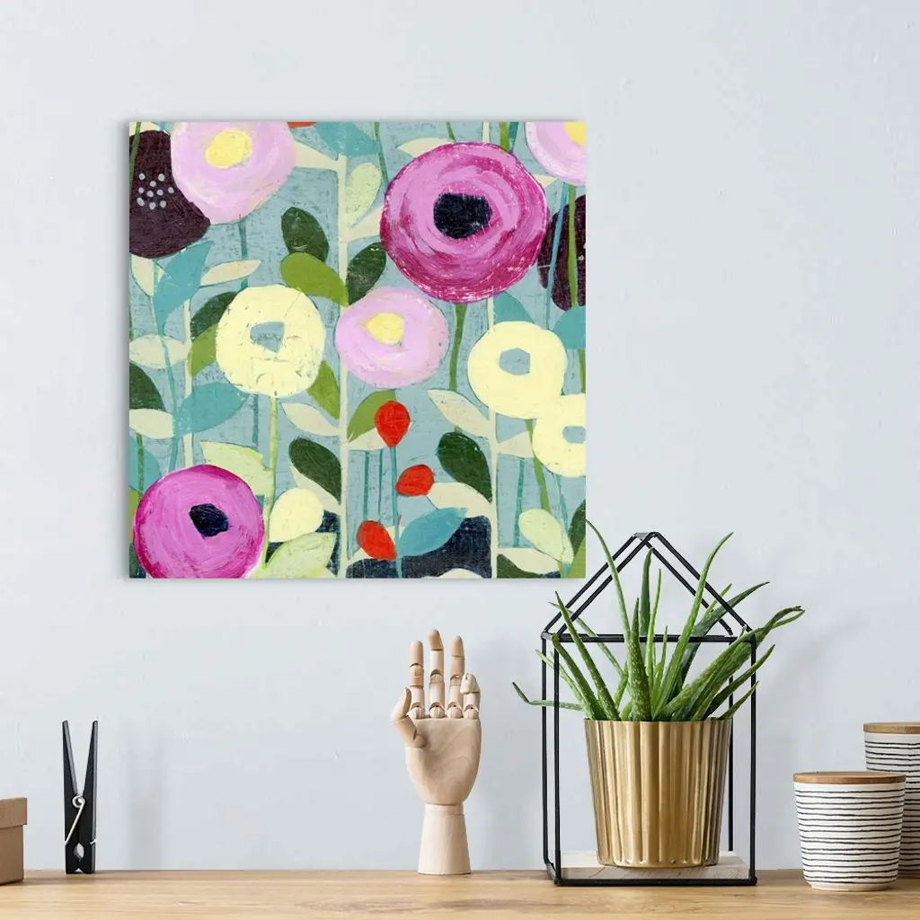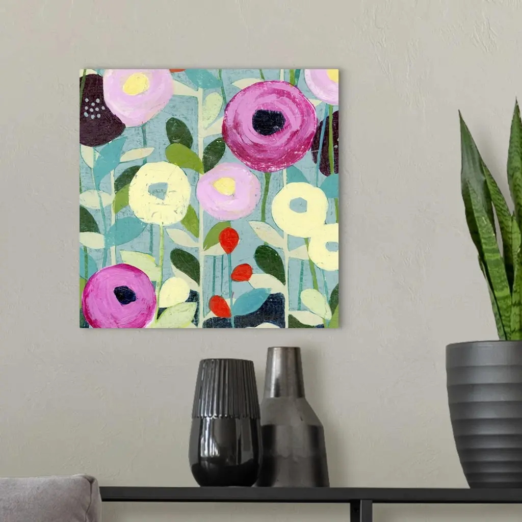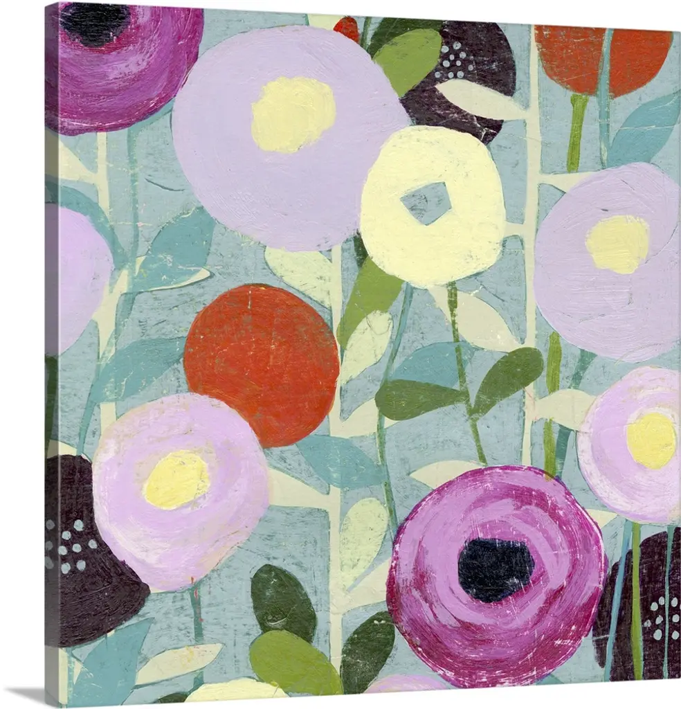 Decorative painting of round poppy flowers in springtime pinks and yellows.