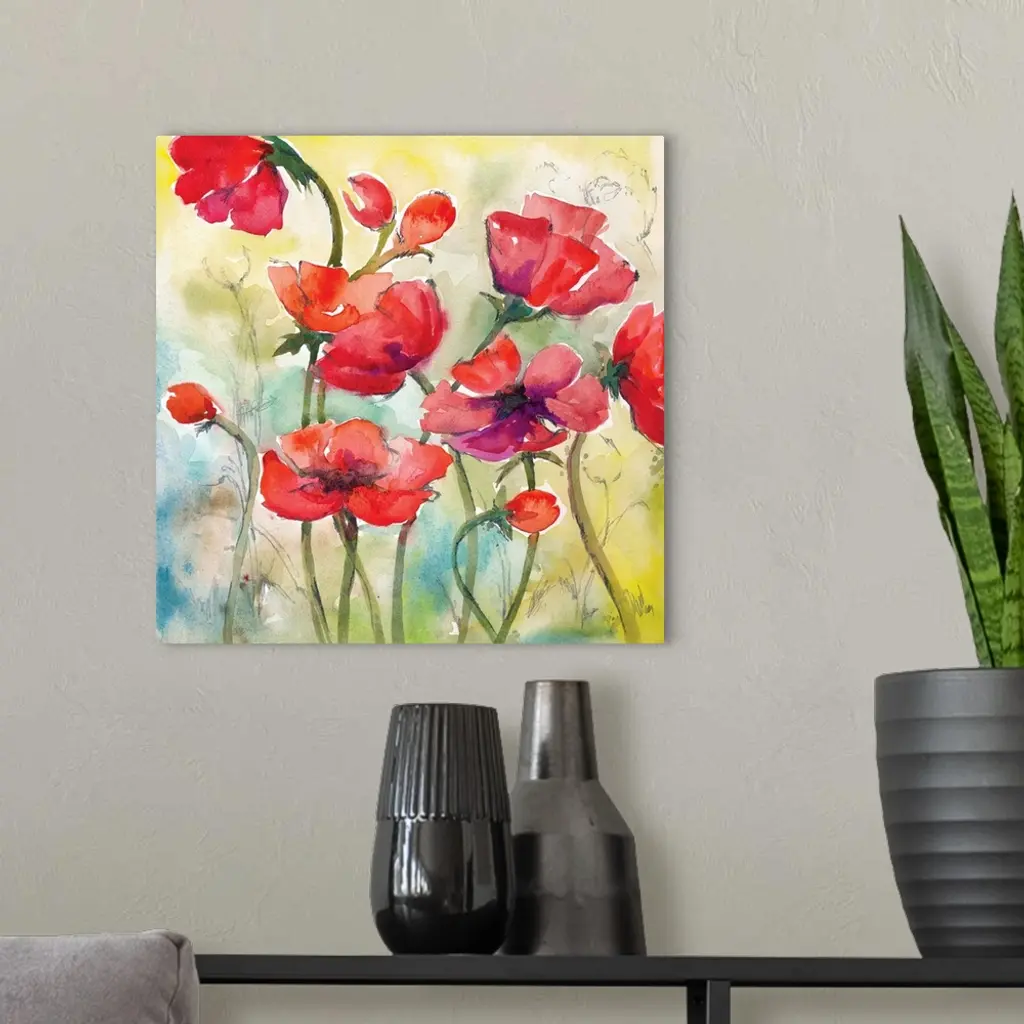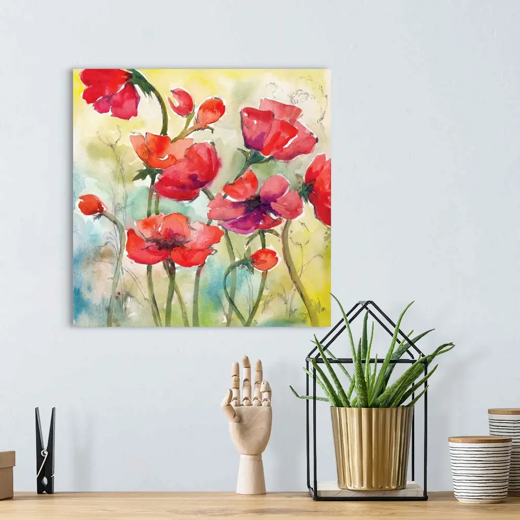 Square watercolor painting of red poppies with hints of purple on a blue, green, and yellow background with light sketches.