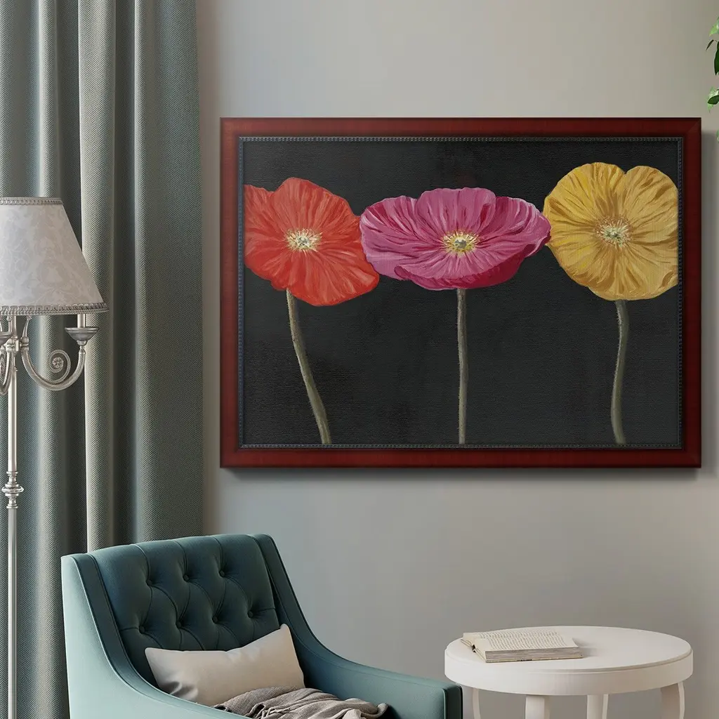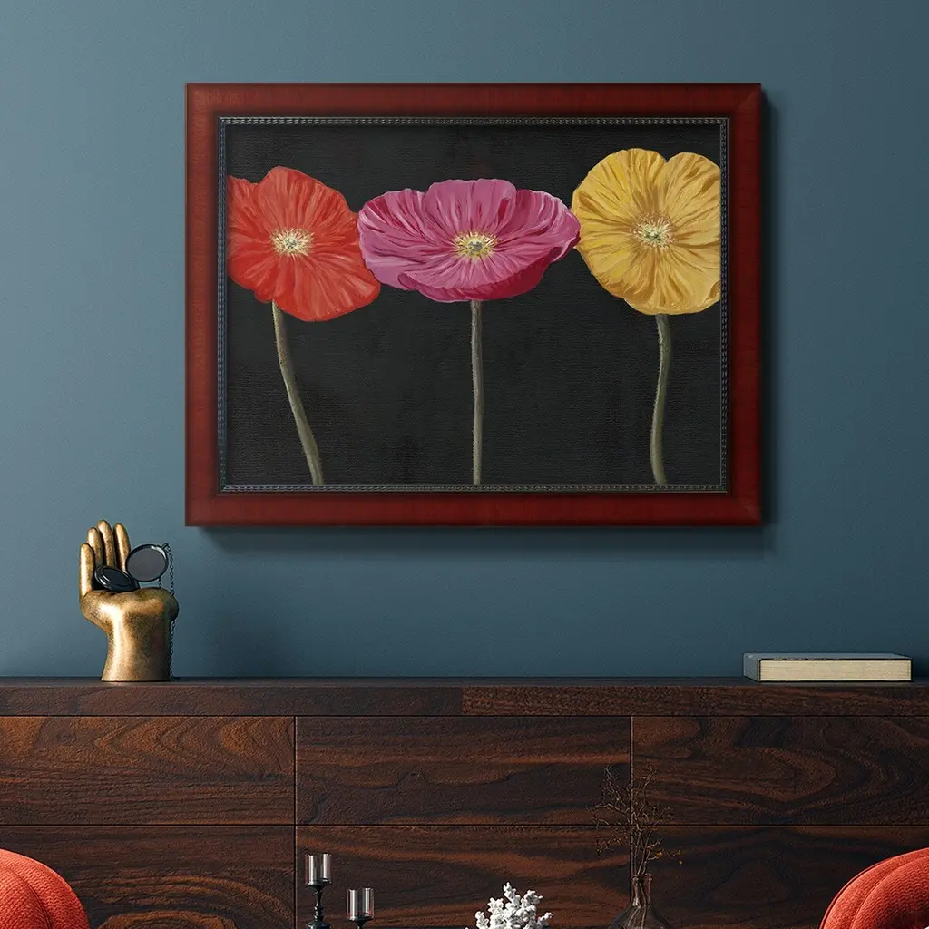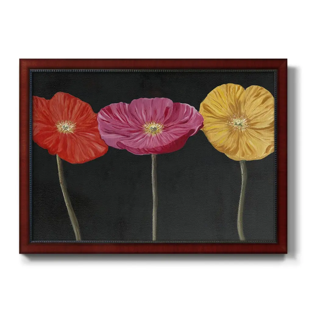 Poppy Trio II Premium Framed Canvas- Ready to Hang A Premium Framed Canvas created to last. Framed in distressed wood and available in an array of sizes and colors Featuring a beveled a solid wood stretcher bar, each piece comes ready to hand 3 SIZES AVAILABLE 16''X20'' - Overall Size 18'X27'' - Overall Size 24''x36'' - Overall Size Each piece is made to order. Each piece comes with hanging hardware. Made in the USA Ready to Hang Giclee Paper Print Acrylic Glass Beveled Matt Board