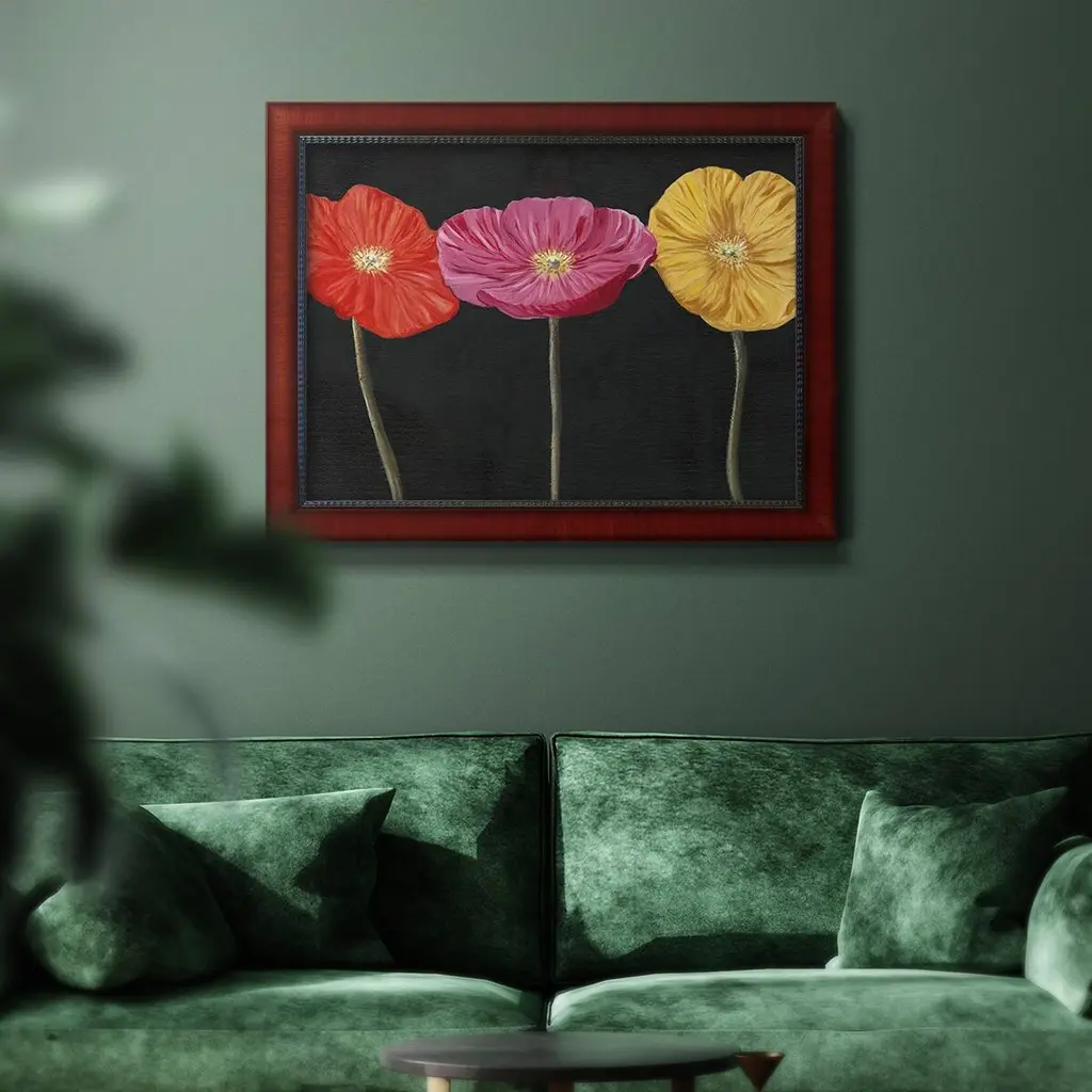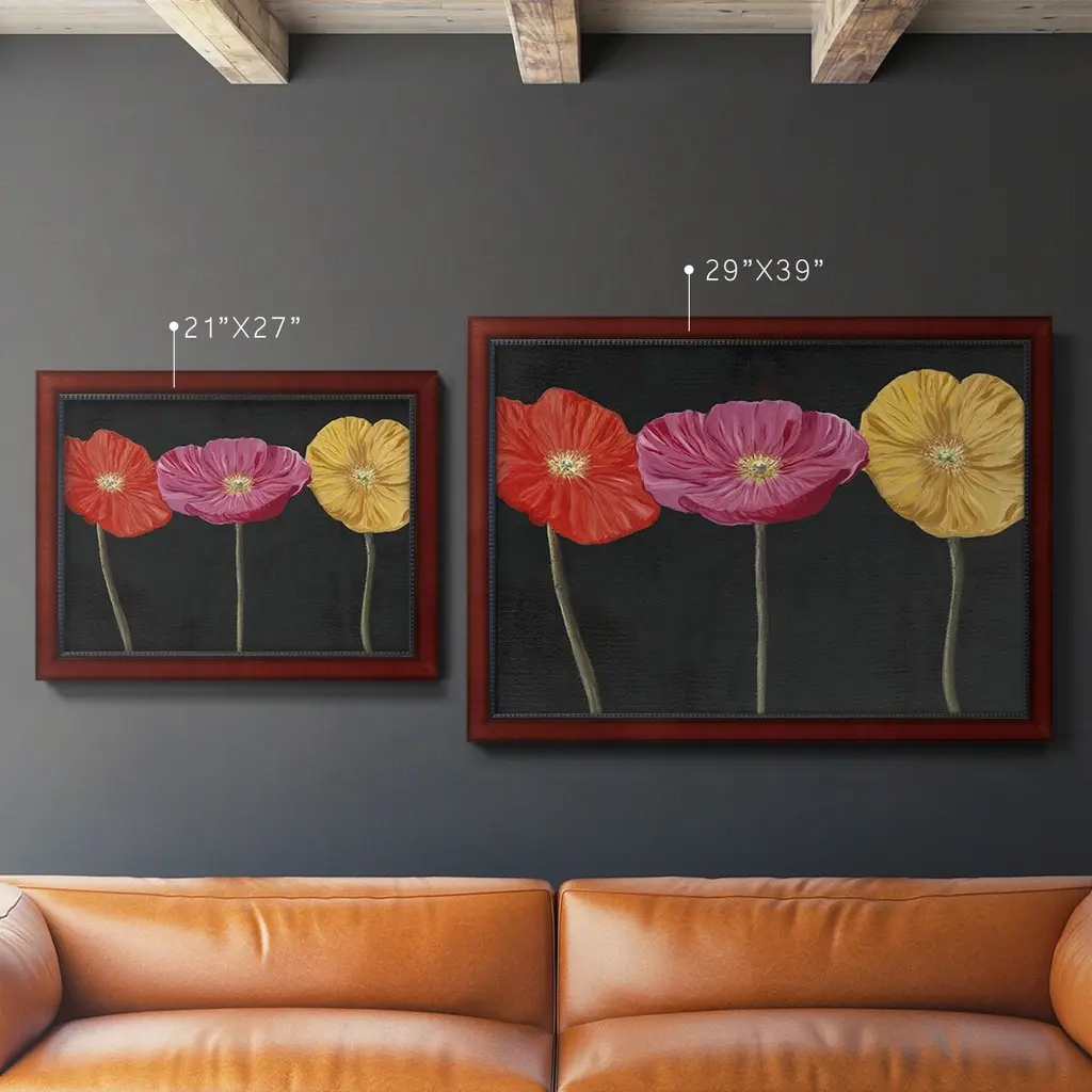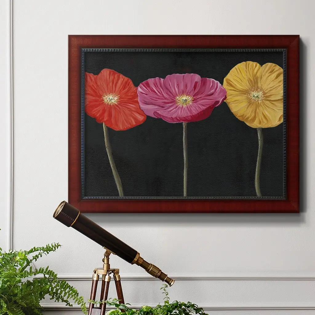 Poppy Trio II Premium Framed Canvas- Ready to Hang A Premium Framed Canvas created to last. Framed in distressed wood and available in an array of sizes and colors Featuring a beveled a solid wood stretcher bar, each piece comes ready to hand 3 SIZES AVAILABLE 16''X20'' - Overall Size 18'X27'' - Overall Size 24''x36'' - Overall Size Each piece is made to order. Each piece comes with hanging hardware. Made in the USA Ready to Hang Giclee Paper Print Acrylic Glass Beveled Matt Board